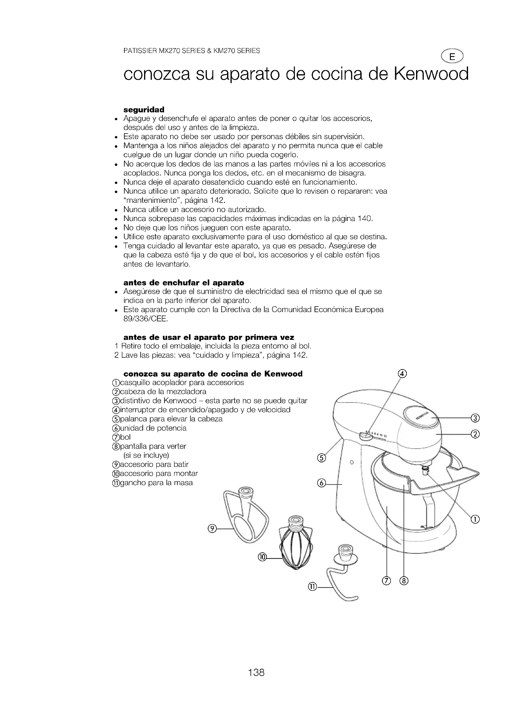 Este aparato cumple con la Directiva de la Comunidad Económica Europea 89/336/CEE. antes de usar el aparato por primera vez 1 Retire todo el embalaje, incluida la pieza entorno al bol. 2 Lave las piezas: vea “cuidado y limpieza”, página 142. conozca su aparato de cocina de Kenwood casquillo acoplador para accesorios cabeza de la mezcladora distintivo de Kenwood – esta parte no se puede quitar interruptor de encendido/apagado y de velocidad palanca para elevar la cabeza unidad de potencia bol pantalla para verter (si se incluye) accesorio para batir accesorio para montar gancho para la masa
