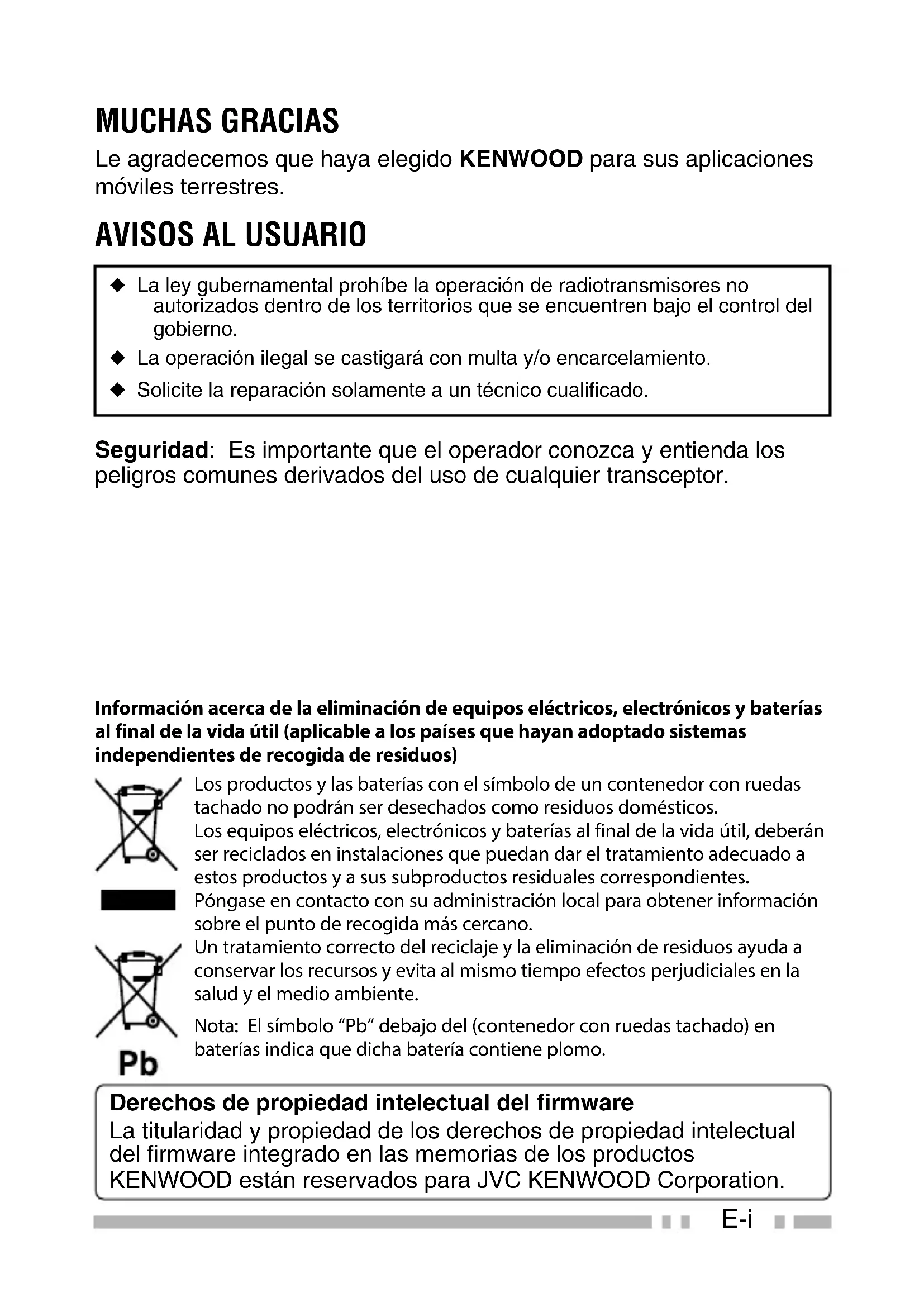 ◆ La ley gubernamental prohíbe la operación de radiotransmisores no autorizados dentro de los territorios que se encuentren bajo el control del gobierno. ◆ La operación ilegal se castigará con multa y/o encarcelamiento. ◆ Solicite la reparación solamente a un técnico cualificado. Seguridad: Es importante que el operador conozca y entienda los peligros comunes derivados del uso de cualquier transceptor. Derechos de propiedad intelectual del firmware La titularidad y propiedad de los derechos de propiedad intelectual del firmware integrado en las memorias de los productos KENWOOD están reservados para JVC KENWOOD Corporation. Información acerca de la eliminación de equipos eléctricos, electrónicos y baterías al final de la vida útil (aplicable a los países que hayan adoptado sistemas independientes de recogida de residuos) Los productos y las baterías con el símbolo de un contenedor con ruedas tachado no podrán ser desechados como residuos domésticos. Los equipos eléctricos, electrónicos y baterías al final de la vida útil, deberán ser reciclados en instalaciones que puedan dar el tratamiento adecuado a estos productos y a sus subproductos residuales correspondientes. Póngase en contacto con su administración local para obtener información sobre el punto de recogida más cercano. Un tratamiento correcto del reciclaje y la eliminación de residuos ayuda a conservar los recursos y evita al mismo tiempo efectos perjudiciales en la salud y el medio ambiente. Nota: El símbolo “Pb” debajo del (contenedor con ruedas tachado) en baterías indica que dicha batería contiene plomo.E-ii PRECAUCIONES