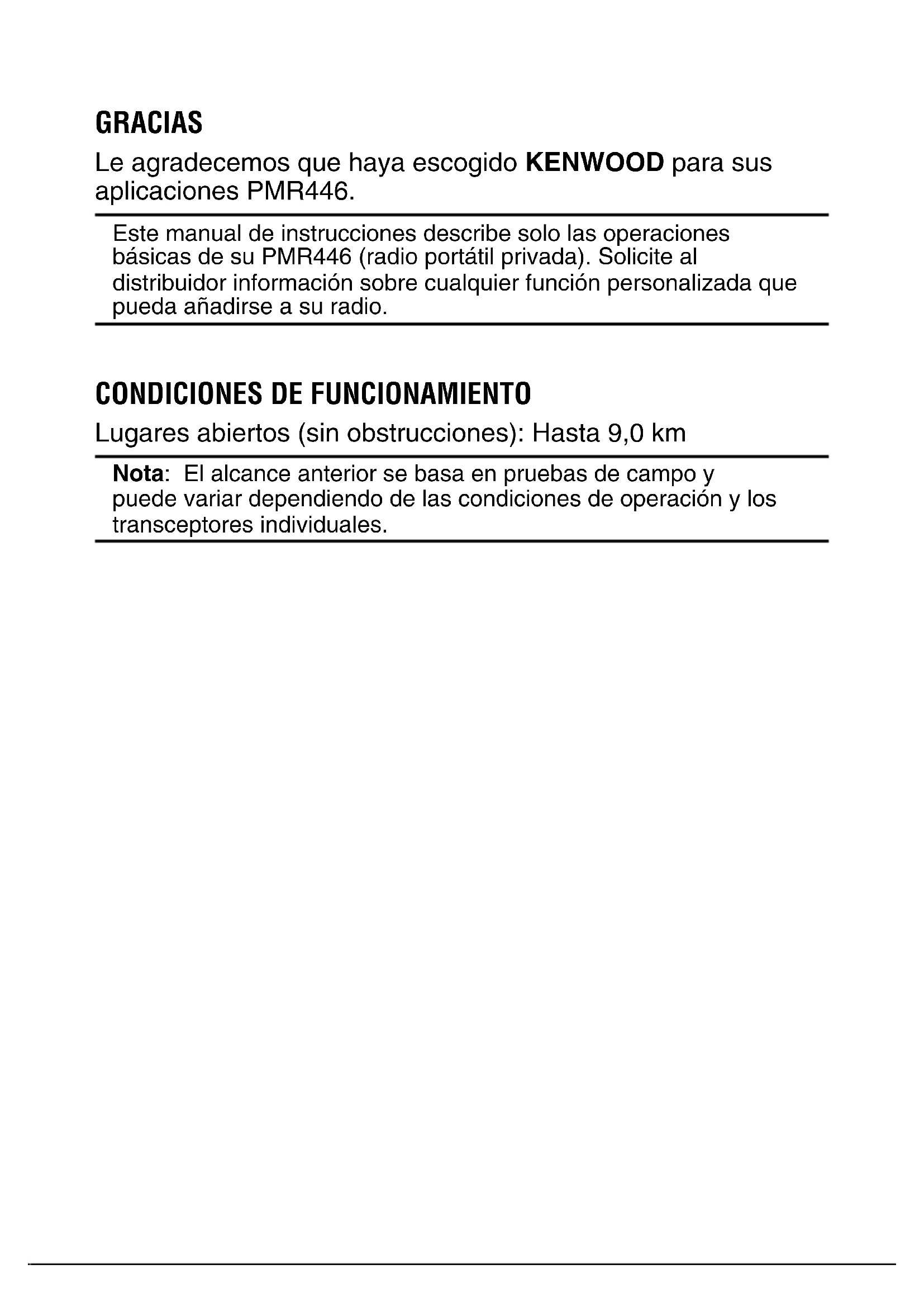Le agradecemos que haya escogido KENWOOD para sus aplicaciones PMR446. Este manual de instrucciones describe solo las operaciones básicas de su PMR446 (radio portátil privada). Solicite al distribuidor información sobre cualquier función personalizada que pueda añadirse a su radio.