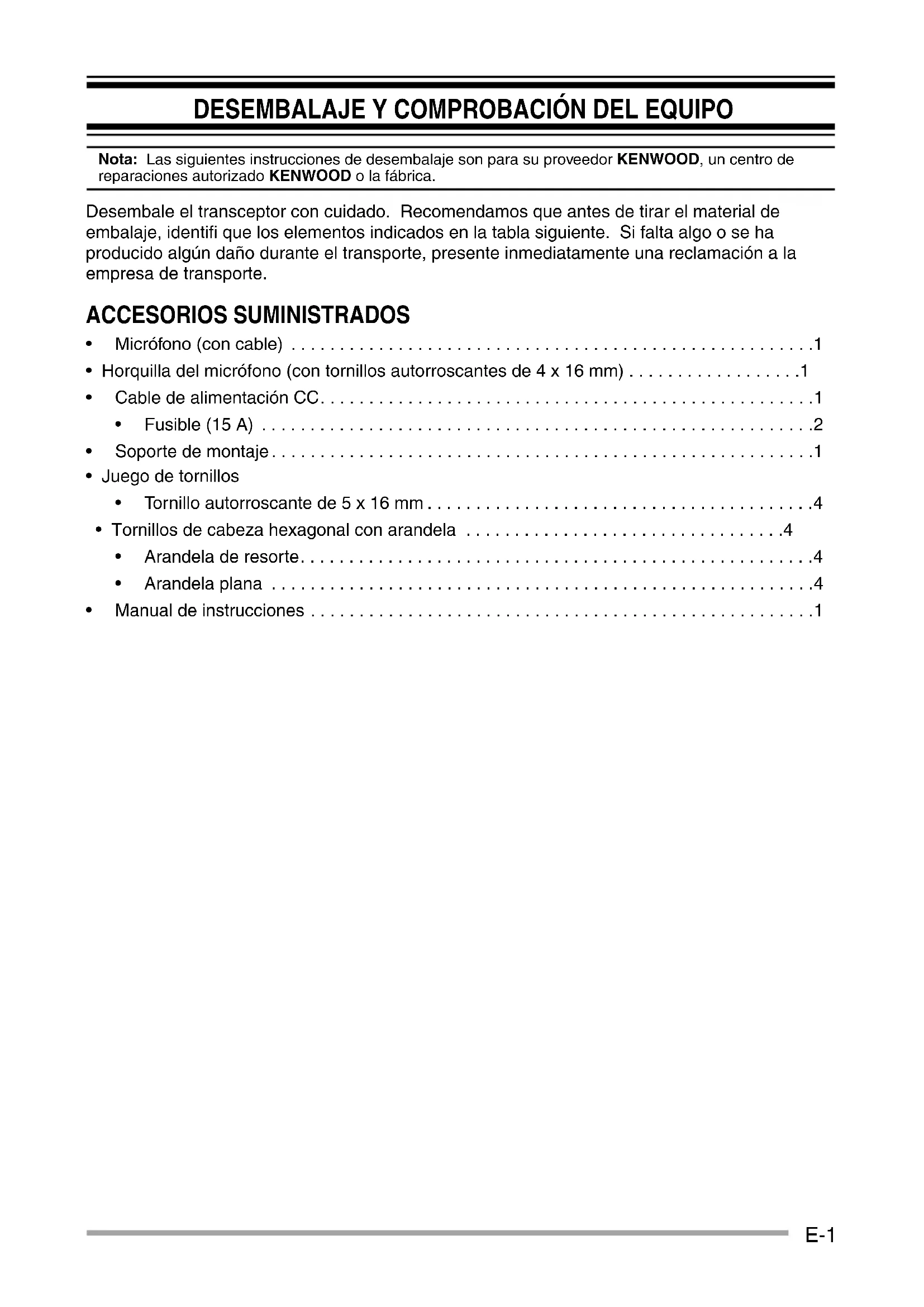 Nota: Las siguientes instrucciones de desembalaje son para su proveedor KENWOOD, un centro de reparaciones autorizado KENWOOD o la fábrica. Desembale el transceptor con cuidado. Recomendamos que antes de tirar el material de embalaje, identifi que los elementos indicados en la tabla siguiente. Si falta algo o se ha producido algún daño durante el transporte, presente inmediatamente una reclamación a la empresa de transporte. ACCESORIOS SUMINISTRADOS