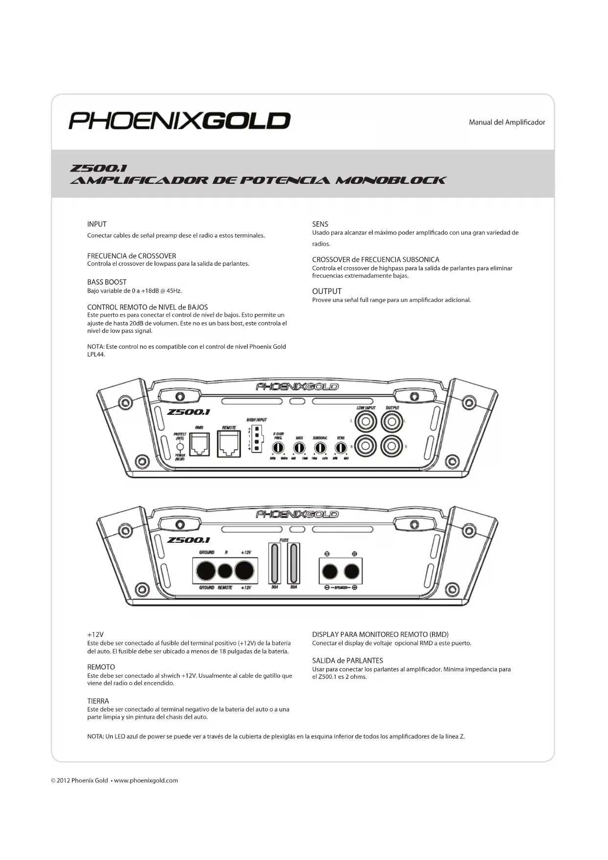 alcanzara el máximo output sin distorsión al nivel de volumen ajustado en el paso 10. No poder: Chequear el voltaje al amplicador con un DMM (voltímetro). +12v y R (con el radio encendido) el voltaje debería ser entre 11.5V y 14.4V cuando se usa la tierra del amplicador. Chequear el fusible del amplicador y la batería. Vericar la conexión desde un nal del fusible hasta el otro con un meter, a veces las rupturas no son visibles. Si el fusible está quemado, chequear el cable de poder y también el amplicador por un corto. Si el corto es en el amplicador, llévelo a su agente autorizado Phoenix Gold. Si no hay corto, solo reemplace el fusible. Poder pero no sonido: Apague el amplicador y chequee todos los cables de señal de entrada y salida, y las conexiones de poder. Chequear los parlantes para ver si hay corto con un DMM (voltímetro) o conectándolos a otra fuente de sonido. Luego de chequear que todo este correcto puede encender el amplicador. Poder pero no sonido y el PROTECTED LED esta encendido: El PROTECTED LED rojo se ilumina cuando el amplicador se apaga por protección contra recalentamiento o exceso corriente. Una temperatura interna de operación excesiva provocara que se apague: Luego de enfriarse aproximadamente 5°C, el amplicador se reinicia. Un corto en los parlantes o una baja impedancia provoca que se apague por exceso de corriente: Encender el amplicador para reiniciar operación. Chequear por cortos o daños en el cableado de los parlantes o crossover del sistema si se apaga por exceso de corriente. No sonido de uno o más canales: Chequear por exceso de voltaje en los terminales de +12V y tierra. Chequear el control de balance del radio. Chequear las conexiones de los parlantes. Chequear la conexión de señal de input. Muy bajo output: Chequear el control de fader del radio o el nivel de sensibilidad de input del amplicador. Asegurarse que el control de frecuencia subsónica no esté demasiado alto y el control de frecuencia LP no esté muy bajo al mismo tiempo. Frecuentes apagados del amplicador con reencendido automáticamente: Este indica apagado crónico del amplicador por constante operación a alta temperatura interna. Operación a alta temperatura puede ser causa de inadecuada ventilación. Asegúrese que no está operando a una impedancia menor a la recomendada. También chequee por daños en los parlantes, o passive crossover. Finalmente, apagados térmicos crónicos pueden ser el resultado de otras operaciones normales del amplicador a elevados niveles de output, lo cual puede ser solucionado previendo adicional enfriamiento al amplicador, instalando un amplicador de alto poder o reduciendo el nivel de output. “Motor Boating” – El indicador de poder se apaga repetitivamente cuando el sistema esta encendido: Chequear la conexión del amplicador a la batería. Chequear el voltaje de la batería. Si es bajo, recargar o reemplazar la batería. Chequear las conexiones de tierra. SISTEMA TUNING Corrección de problemasManuel de l’amplicateur © 2012 Phoenix Gold • www.phoenixgold.com Spécifications CARACTÉRISTIQUES Z500.4: Réponse en fréquence: ± 1dB de 20Hz à 20kHz Rapport signal/bruit: >100dB Filtres passifs passe-haut et passe-bas: 12dB par Octave Plage du ltre passif passe-bas: 40Hz à 400Hz Plage du ltre passif passe-haut: 40Hz à 400Hz Gamme d’entrée de niveau faible: 200 millivolts à 8 volts Charge minimale recommandée: 4 ohms en dérivation ou 2 ohms en stéréo Ecacité type: 50% Taux d’amortissement: Supérieur à 200 Puissance de Sortie 75 x 4 @ 4 ohms Stereo 125 x 4 @ 2 ohms Stereo 250 x 2 @ 4 ohms Bridged Taille du l d’alimentation/de masse: calibre 8 Dimensions (Comprend les pieds de montage): 12.5” L x 8.34” W x 2.1” H 318mm L x 213mm W x 53mm H CARACTÉRISTIQUES Z500.1: Réponse en fréquence: ± 1dB from 20Hz à 300Hz Rapport signal/bruit : >100dB Filtres passifs passe-bas: 12dB par Octave Filtres passifs subsoniques: 12dB par Octave Plage du ltre passif passe-bas: 30Hz à 300Hz Plage du ltre passif subsonique: 10Hz à 55Hz Amplication des basses à 45 Hz: 0 to +18dB Gamme d’entrée de niveau faible: 200 millivolts à 8 volts Charge minimale recommandée: 2 ohms Ecacité type: 50% Taux d’amortissement: Supérieur à 200 Puissance de Sortie 300 x 1 @ 4 ohms 500 x 1 @ 2 ohms Taille du l d’alimentation/de masse: calibre 8 Dimensions (Comprend les pieds de montage): 12.5” L x 8.34” W x 2.1” H 318mm L x 213mm W x 53mm H CARACTÉRISTIQUES Z250.2: Réponse en fréquence: ± 1dB de 20Hz à 20kHz Rapport signal/bruit: >100dB Filtres passifs passe-haut et passe-bas: 12dB par Octave Plage du ltre passif passe-bas: 40Hz à 400Hz Plage du ltre passif passe-haut: 40Hz à 400Hz Amplication des basses à 45 Hz: 0 to +18dB Gamme d’entrée de niveau faible: 200 millivolts à 8 volts Charge minimale recommandée: 4 ohms en dérivation ou 2 ohms en stéréo Ecacité type: 50% Taux d’amortissement: Supérieur à 200 Puissance de Sortie 75 x 4 @ 4 ohms Stereo 125 x 4 @ 2 ohms Stereo 250 x 2 @ 4 ohms Bridged Taille du l d’alimentation/de masse: calibre 8 Dimensions (Comprend les pieds de montage): 12.5” L x 8.34” W x 2.1” H 318mm L x 213mm W x 53mm HManuel de l’amplicateur © 2012 Phoenix Gold • www.phoenixgold.com ENTRÉE Reliez les câbles de signal préampli de l’unité principale sur ces bornes.