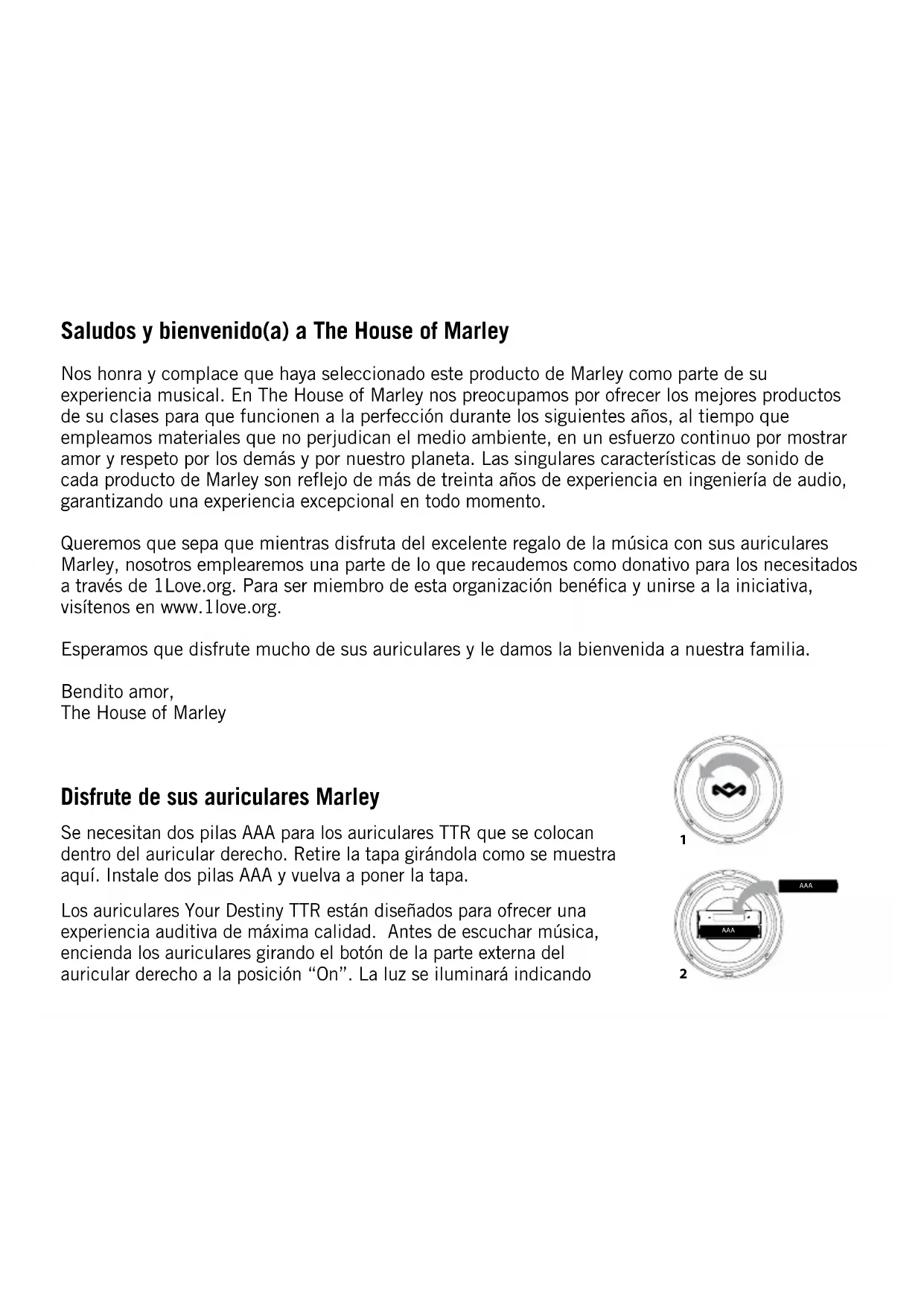 2que los auriculares están encendidos y listos para el uso. La tecnología de los auriculares TTR bloqueará automáticamente cualquier ruido externo no deseado y le ofrecerá los detalles y la potencia que su música se merece. Los auriculares Destiny Trenchtown Work se suministran con dos cables. Un cable se usa para escuchar música mientras se está en movimiento y al utilizar los auriculares con un teléfono para realizar llamadas. El segundo cable tiene una longitud mucho mayor y se utiliza para escuchar música cuando no se está en movimiento, alejado del dispositivo de audio. Cada cable tiene un conector recto de 3,5 mm en el extremo que se enchufa a la toma de entrada de la parte inferior del auricular izquierdo. Compatibilidad del micrófono y del control de un botón El micrófono integrado permite tener conversaciones con las manos libres. Apriete el botón para responder a una llamada; vuelva a apretarlo para finalizarla. Escucha responsable Asegúrese de bajar el volumen del reproductor de música antes de que empiece a sonar, para evitar el riesgo de dañar sus oídos con un nivel de volumen demasiado alto. No utilice nunca auriculares mientras maneja maquinaria, conduce un vehículo o realiza cualquier otra actividad en la que sea importante escuchar los sonidos del exterior. Si alguna vez nota dolor o molestias mientras escucha música con los auriculares o después, es posible que el volumen sea excesivo y pueda causar daños auditivos permanentes. “O” Position “On” Position de enPautas de niveles permisibles de ruido y duraciones de la exposición de la OSHA (Occupational Safety and Health Administration). Nivel de presión sonora (SPL) Exposición diaria máxima recomendada 90dB 8 horas 92dB 6 horas 95dB 4 horas 100dB 2 horas 105dB 1 hora 110dB 30 minutos 115dB 15 minutos Mayor de 115 dB Evite niveles SPL de 115 dB y más Este símbolo indica que este artículo no se debe tirar a la basura con otros residuos domésticos en ningún lugar de la UE. A fin de prevenir los efectos perjudiciales que la eliminación sin control de los residuos puede tener sobre el medio ambiente o la salud de las personas, le rogamos que los recicle de forma responsable para fomentar la reutilización sostenible de los recursos materiales. Para devolver su dispositivo usado, utilice los sistemas de devolución y recogida o póngase en contacto con la empresa a la que le compró el artículo, la cual lo podrá recoger para que se recicle de forma segura para el medio ambiente. Explicaci ón RAEEGarantía limitada por dos años The House of Marley, LLC vende sus productos con la intención de que estén libres de defectos en fabricación y mano de obra durante dos años a partir de la fecha de compra original, excepto según se indica a continuación. The House of Marley, LLC garantiza que sus productos estarán libres de defectos en material y mano de obra bajo uso y servicio normales. Esta garantía se extiende únicamente a consumidores y no a minoristas. Para obtener detalles completos de la garantía, visite http://www.thehouseofmarley.com/warranty Para obtener servicio o reparación, no devuelva esta unidad al minorista. Póngase en contacto con Atención al consumidor de The House of Marley, LLC a través de cservice@thehouseofmarley.com, o llame al 1-888-251-