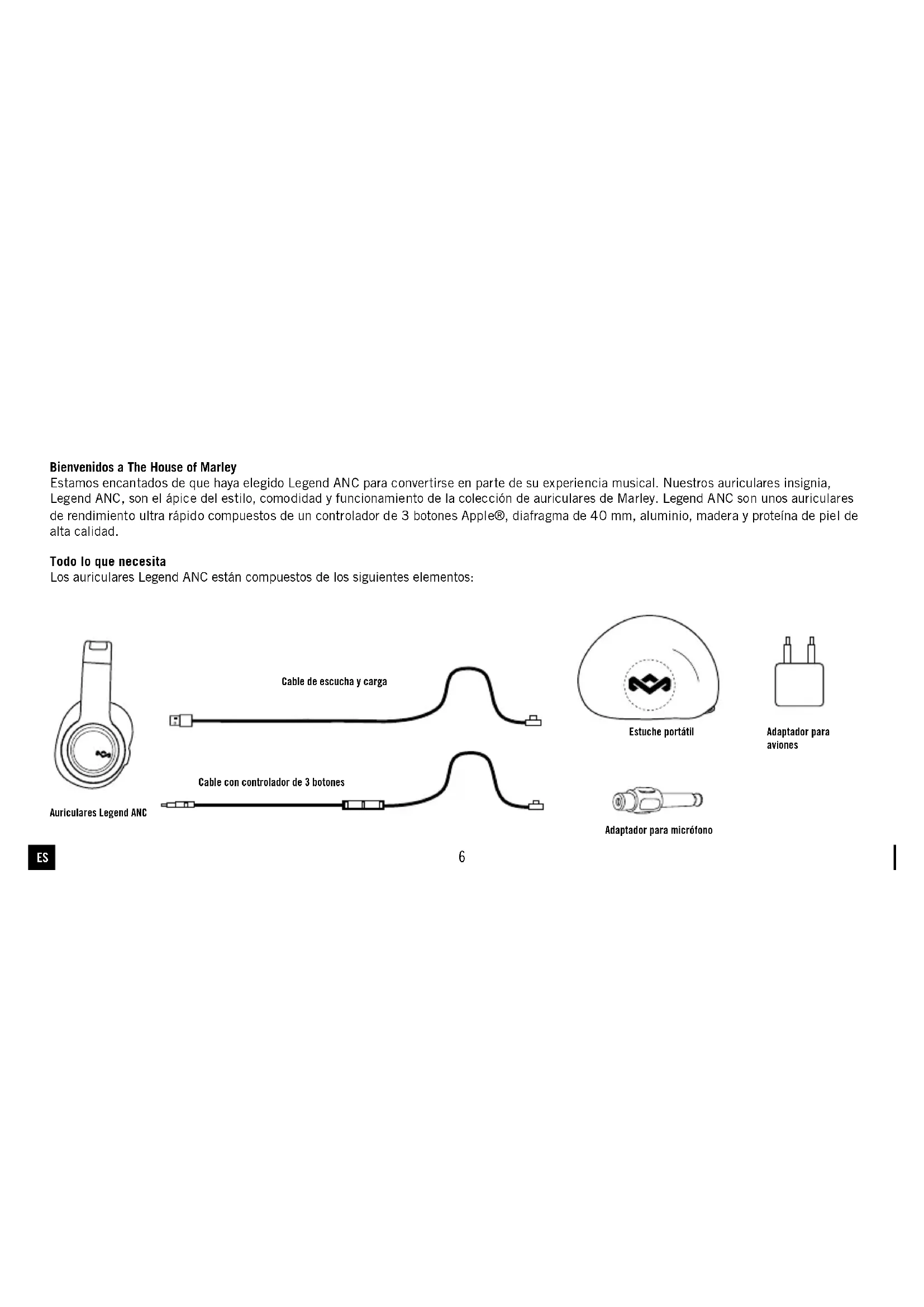 Bienvenidos a The House of Marley Estamos encantados de que haya elegido Legend ANC para convertirse en parte de su experiencia musical. Nuestros auriculares insignia, Legend ANC, son el ápice del estilo, comodidad y funcionamiento de la colección de auriculares de Marley. Legend ANC son unos auriculares de rendimiento ultra rápido compuestos de un controlador de 3 botones Apple®, diafragma de 40 mm, aluminio, madera y proteína de piel de alta calidad. Todo lo que necesita Los auriculares Legend ANC están compuestos de los siguientes elementos: Auriculares Legend ANC Cable con controlador de 3 botones Cable de escucha y carga Estuche portátil Adaptador para micrófono Adaptador para aviones7 Disfrute de sus Legend ANC Los auriculares Legend ANC se pueden utilizar con la función de ANC en “ON” (encendido) u “OFF” (apagado). Para activar en “ON” (encendido) la función de cancelación de ruido, deslice hacia arriba el interruptor situado en el casco derecho. Se encenderá una luz que indicará que ANC está activado. La tecnología de sus Legend ANC cancelará todo el ruido no deseado del exterior aumentando así la potencia y el detalle de la música que escucha. Durante la secuencia en “ON” (encendido), el LED indicador de batería se iluminará para mostrar el nivel de carga. Recarga de su dispositivo Utilice el cable de carga suministrado o cualquier cable Micro-USB estándar para cargar sus Legend ANC. Se puede cargar a través de un puerto USB de un ordenador o con un adaptador de carga USB. Reemplazo de la batería El producto Legend ANC incluye una batería recargable, diseñada con una vida útil extensa igual que el producto. Si en un caso poco probable que usted requiera un repuesto de esta batería, póngase en contacto con el Servicio de Atención al cliente, donde se le proporcionará los detalles de la garantía y fecha expiración de la misma por sustitución de baterías. Controlador de tres botones y compatibilidad con micrófono Su micrófono integrado le permite poder realizar conversaciones con las manos libres. Pulse el botón para contestar llamadas; vuelva a pulsarlo para colgar. Las funciones de play/pausa y tracking que se muestran en las imágenes únicamente funcionan con dispositivos Apple. x1 x1