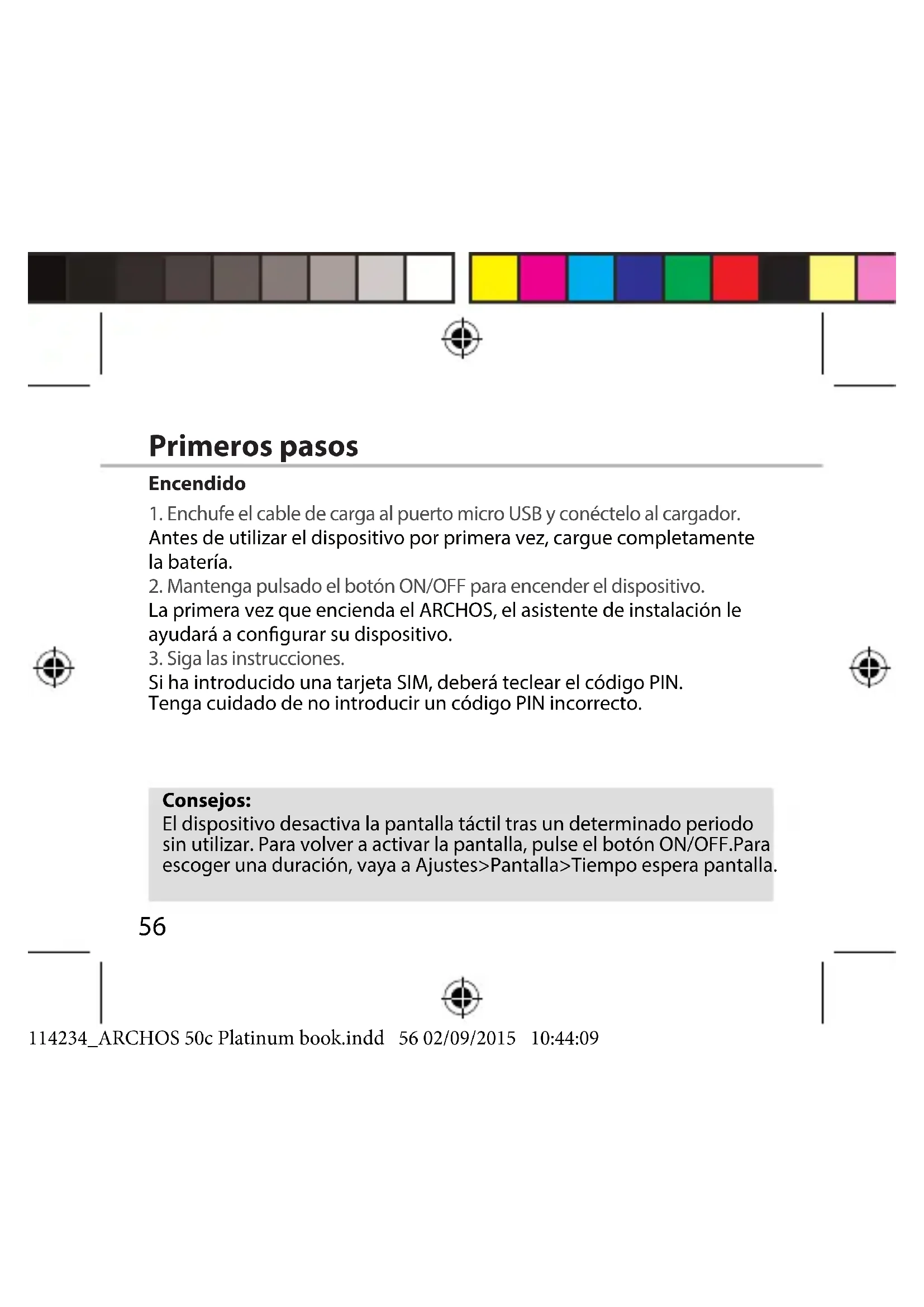 Español Levante la cubierta posterior utilizando la muesca 114234_ARCHOS 50c Platinum book.indd 55 02/09/2015 10:44:0956 Consejos: El dispositivo desactiva la pantalla táctil tras un determinado periodo sin utilizar. Para volver a activar la pantalla, pulse el botón ON/OFF.Para escoger una duración, vaya a Ajustes>Pantalla>Tiempo espera pantalla. Encendido