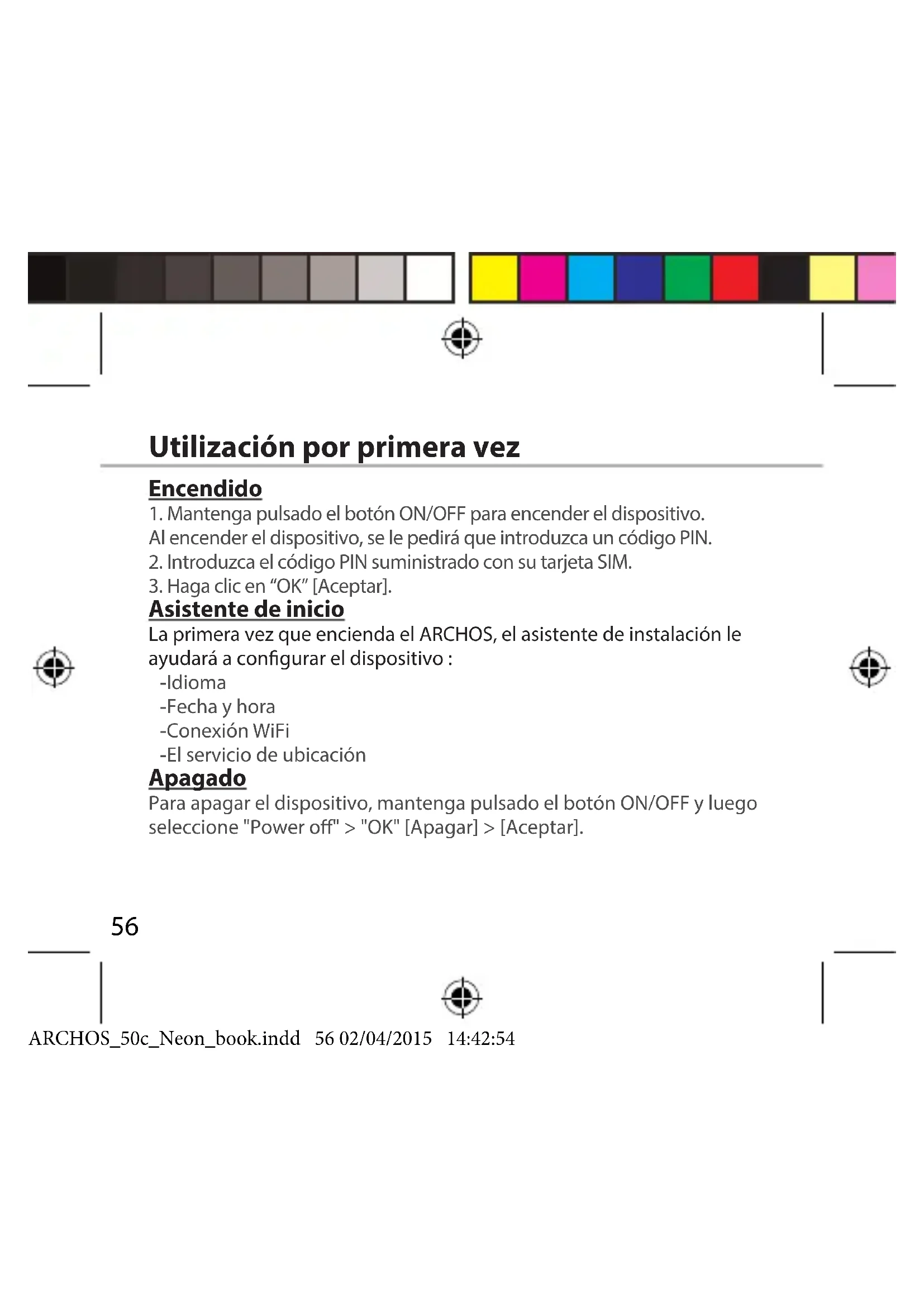 Asistente de inicio La primera vez que encienda el ARCHOS, el asistente de instalación le ayudará a congurar el dispositivo : - Idioma - Fecha y hora - Conexión WiFi - El servicio de ubicación Apagado Para apagar el dispositivo, mantenga pulsado el botón ON/OFF y luego seleccione "Power o" > "OK" [Apagar] > [Aceptar]. ARCHOS_50c_Neon_book.indd 56 02/04/2015 14:42:5457