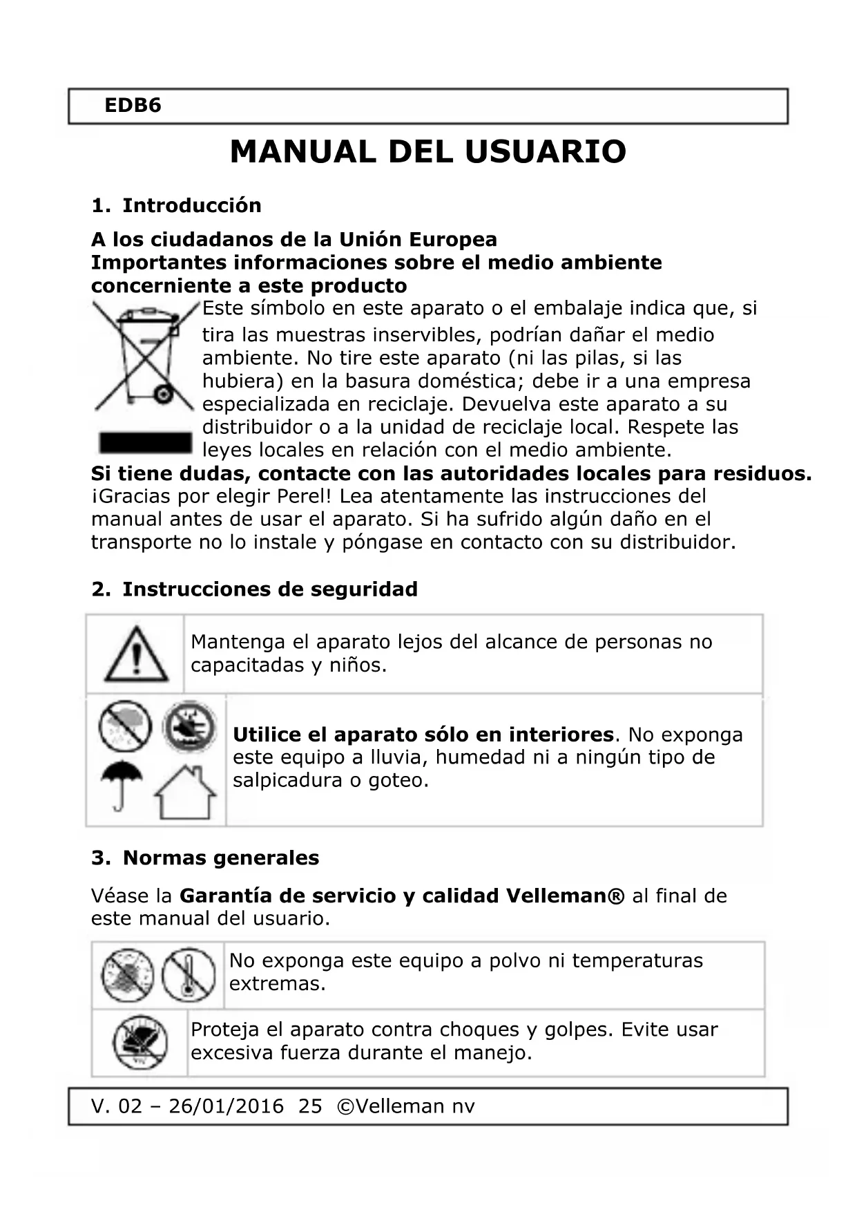 Utilice este aparato solo con los accesorios originales. Velleman NV no sera responsable de daños ni lesiones causados por un uso (indebido) de este aparato. Para más información sobre este producto y la version másrecente de este manual del usuario, visite nuestra頁a www.perel.eu. Se pueda modifier las specifications y el contenido de este manual sin previo avis.