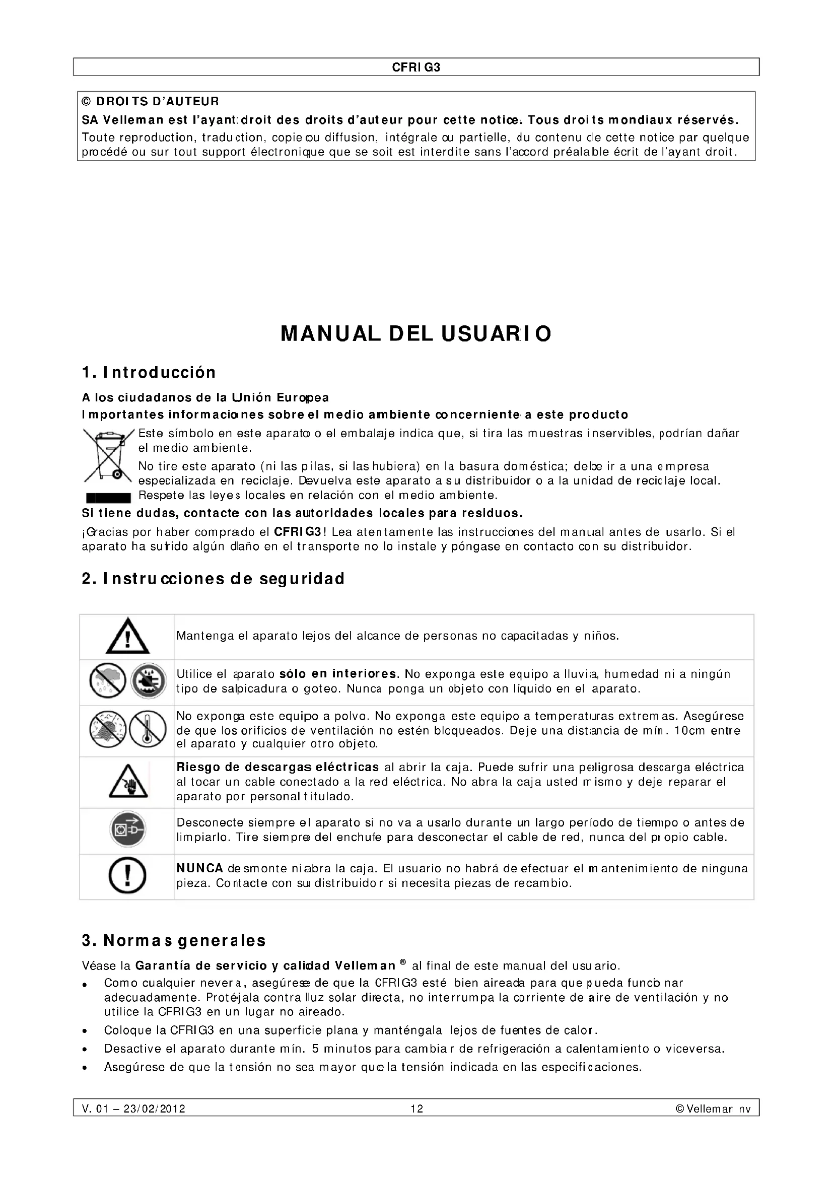 Gracias por haber comprado el CFRIG3! Lea atentamente las instrucciones del manual antes de uso. Si el aparato ha suido algo dano en el transporte no lo instale ypongase en contacto con su distribuidor.
