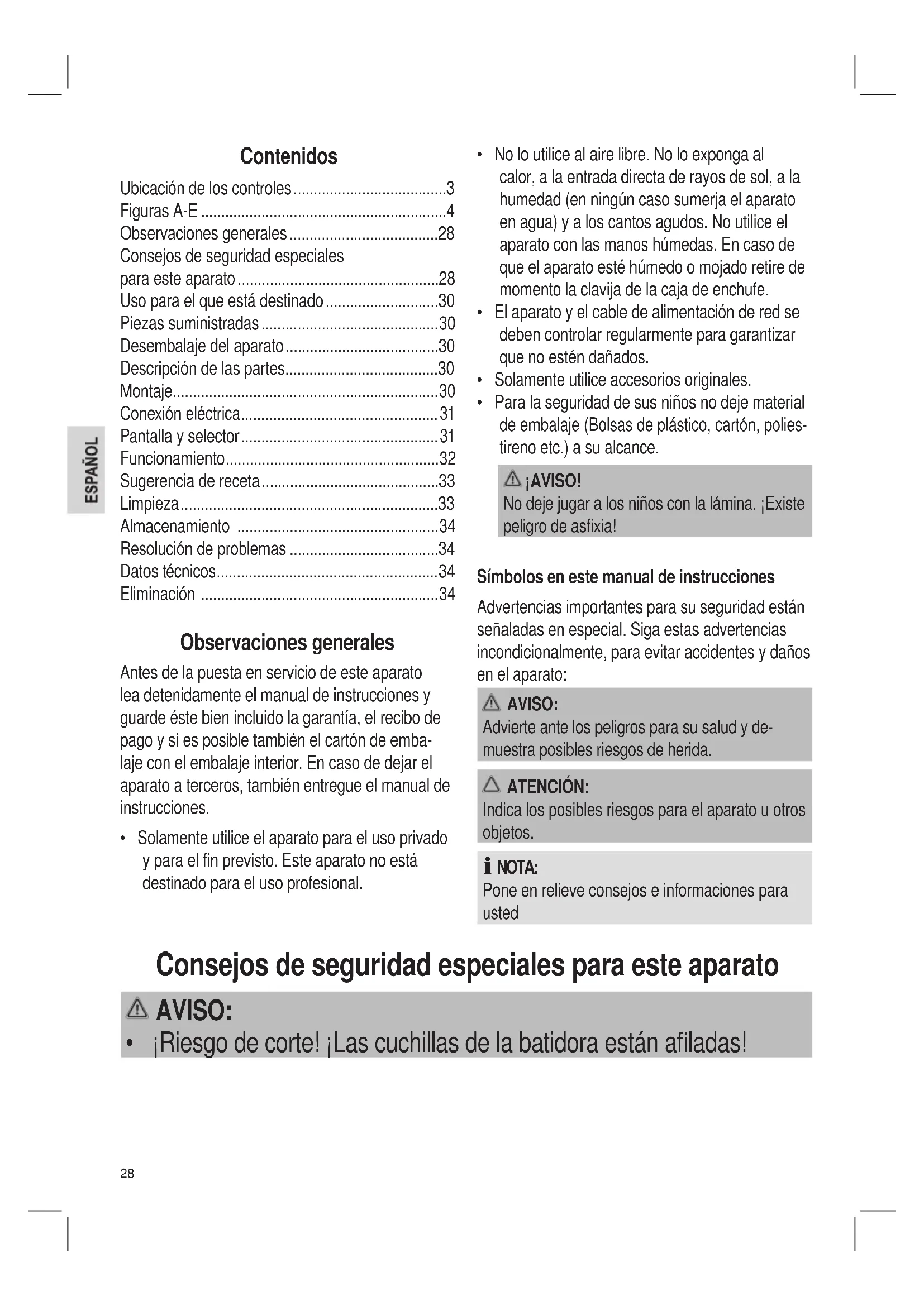 - ¡Riesgodecorte!¡Lascuchillasdelabatidoraestánaladas!29 AVISO: