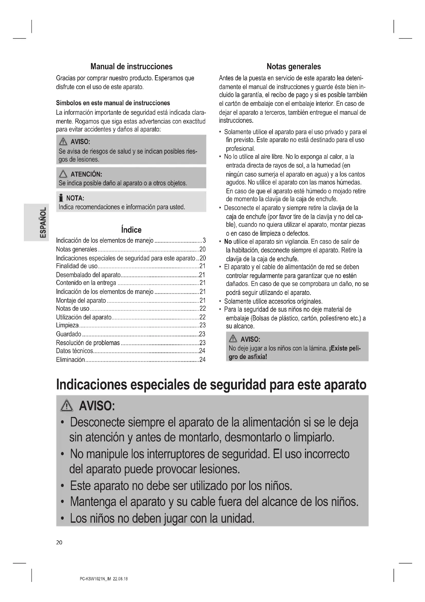 - Manual de instrucciones Gracias por comprar nuestro producto. Esperamos que disfrute con el uso de este aparato. Símbolos en este manual de instrucciones La información importante de seguridad está indicada clara- mente. Rogamos que siga estas advertencias con exactitud para evitar accidentes y daños al aparato: AVISO: Se avisa de riesgos de salud y se indican posibles ries- gos de lesiones. ATENCIÓN: Se indica posible daño al aparato o a otros objetos. NOTA: Indica recomendaciones e información para usted. Índice Indicación de los elementos de manejo p. 3