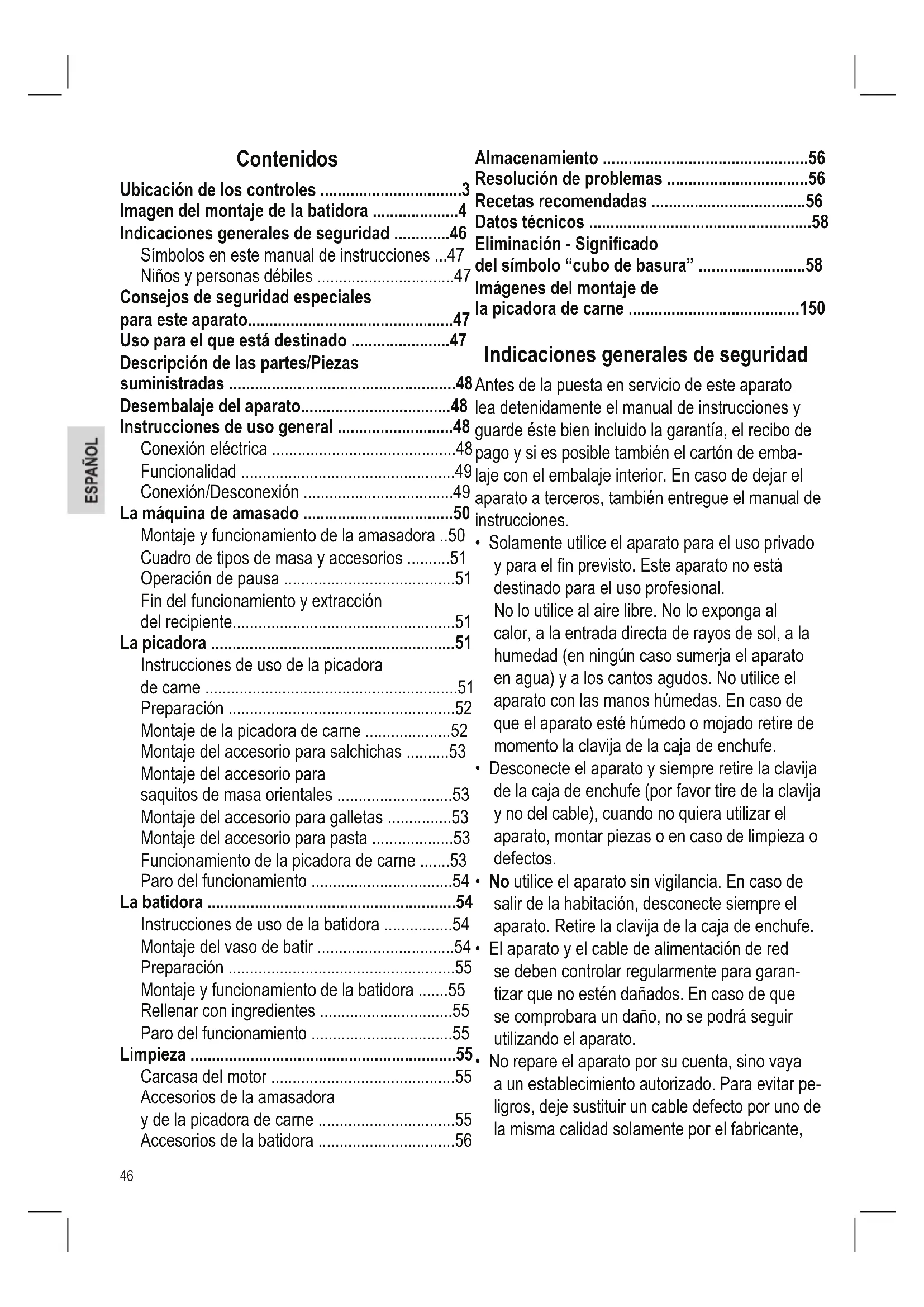 - Picadora para picar alimentos. Puede crear pasta o masa con diferentes accesorios.48 El aparato está diseñado exclusivamente con este n y sólo puede responder a estos usos. Sólo se puede utilizar en la forma descrita en este manual de instrucciones. El aparato no se puede utilizar con nes comercia- les. Cualquier otro uso no se considera como el pretendido y puede dar lugar a daños materiales o incluso lesiones físicas. El fabricante no asume ninguna responsabilidad por los daños derivados de un uso distinto al especicado. Descripción de las partes/piezas suministradas Visión general de los mandos en página 3: 1 Vaso de batir 2 Brazo móvible 3 Palanca para subir/bajar el brazo 4 Botón para MIXING (BATIR) 5 Botón EGG/MILK (HUEVOS/LECHE) 6 Botón FRUIT JUICE (ZUMO DE FRUTAS) 7 Botón GRINDING (TRITURAR) 8 Mando regulador 9 Carcasa del motor 10 Bol para mezclar 11 Protector de salpicaduras 12 Anilla de unión 13 Aro de bloqueo 14 LLenador del ltro 15 Bandeja del llenador 16 Empujador 17 Tapa del conector del ltro 18 Tapa de seguridad para el motor de la batidora 19 Botón para retirar/acoplar la cubierta de seguridad 20 3 discos protectores 21 Varilla para batir 22 Varilla para batir huevos 23 Varilla amasadora Imagen del montaje del vaso de batir en página 4: 1 Vaso de batir 1a Tope 1b Tapa 1c Junta de seguridad 1d Junta anular 1e Conjunto de cuchillas 1f Acoplamiento roscado Imágenes A – E en la última página: 24 Espiral 25 Cuchilla 26 3 discos (no, medio, grueso) 27 Accesorio para salchichas 28 2-piezas de accesorio “picadillo de carne” 29 Adaptador 30 Accesorio para galletas 31 Guía de galletas 32 4 accesorios para pasta (formas distintas de pasta) Desembalaje del aparato