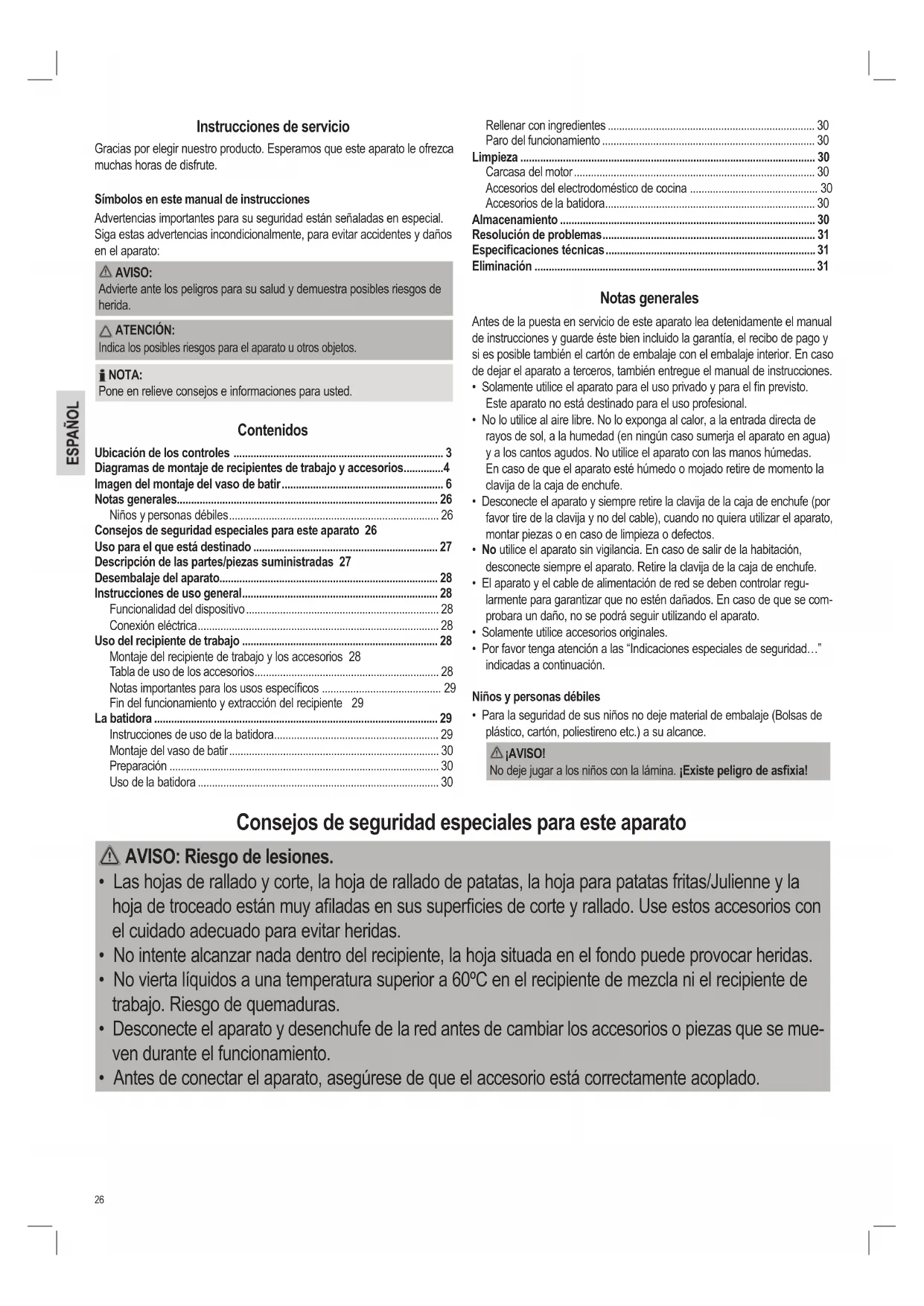 - Por favor tenga atención a las “Indicaciones especiales de seguridad…” indicadas a continuación. Niños y personas débiles