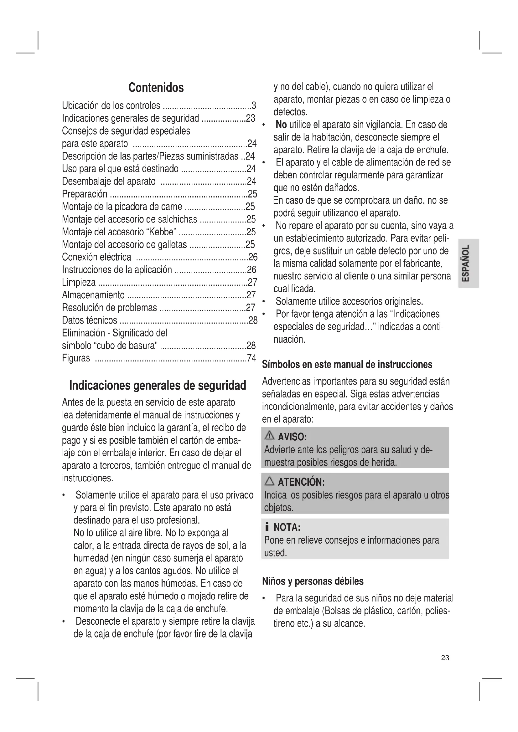 - Losinfantilesdeberíanservigilados,paraase- gurar que no jueguen con el aparato. Consejos de seguridad especiales para este aparato AVISO: ¡Riesgo de heridas!