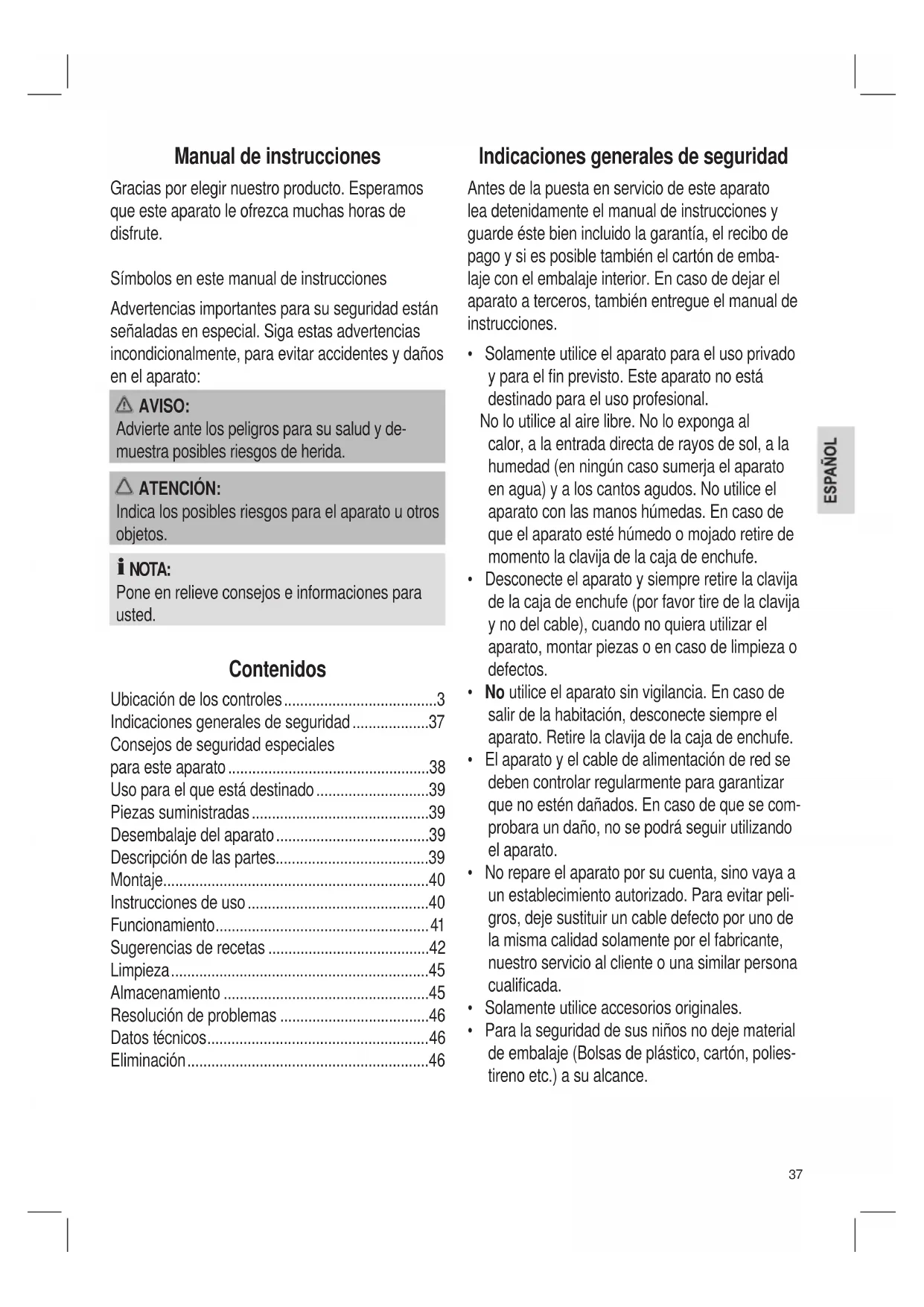 - Eliminación Indicaciones generales de seguridad Antes de la puesta en servicio de este aparato lea detenidamente el manual de instrucciones y guardeéstebienincluidolagarantía,elrecibode pagoysiesposibletambiénelcartóndeemba- laje con el embalaje interior. En caso de dejar el aparatoaterceros,tambiénentregueelmanualde instrucciones. p. 46