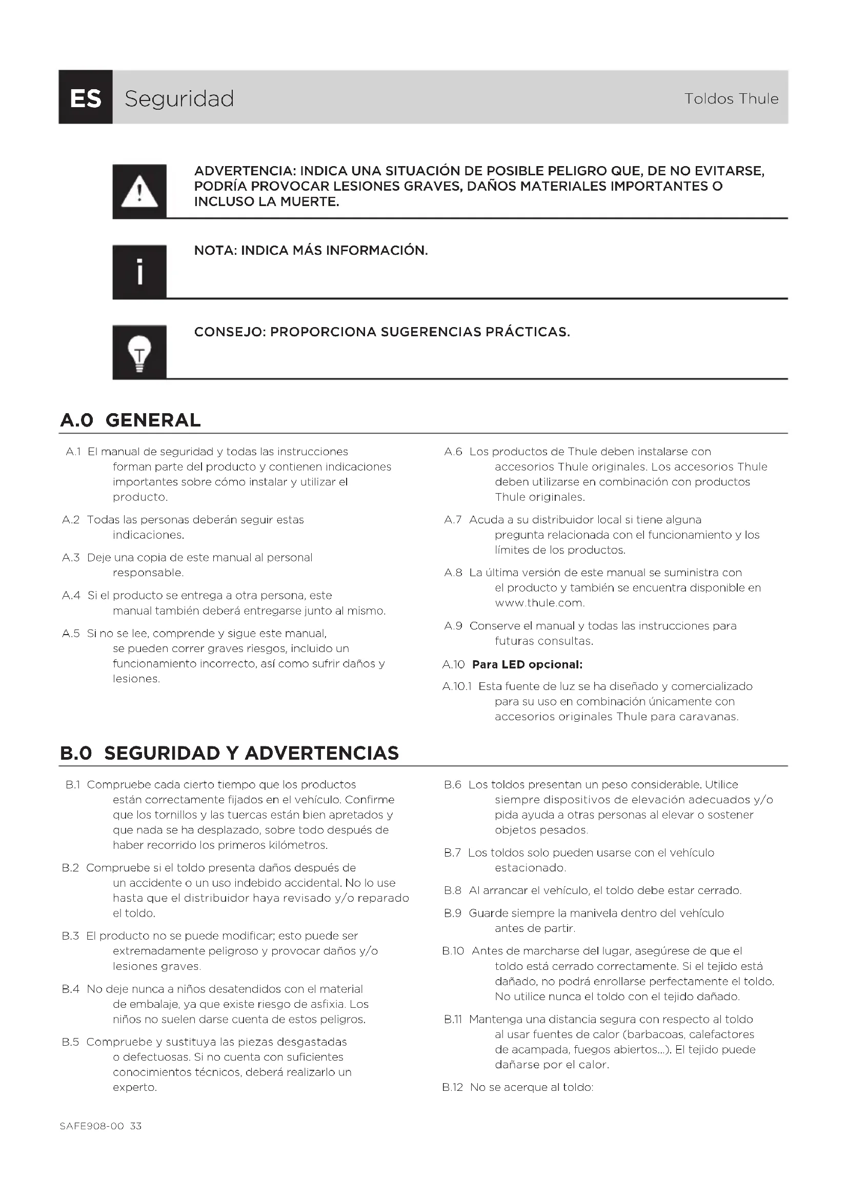 Seguridad Toldos Thule ADVERTENCIA: INDICA UNA SITUACIÓN DE POSIBLE PELIGRO QUE, DE NO EVITARSE, PODRÍA PROVOCAR LESIONES GRAVES, DAÑOS MATERIALES IMPORTANTES O INCLUSO LA MUERTE. NOTA: INDICA MÁS INFORMACIÓN. CONSEJO: PROPORCIONA SUGERENCIAS PRÁCTICAS. A.0 GENERAL A.1 El manual de seguridad y todas las instrucciones forman parte del producto y contienen indicaciones importantes sobre cómo instalar y utilizar el producto. A.2 Todas las personas deberán seguir estas indicaciones.A.3 Deje una copia de este manual al personal responsable.A.4 Si el producto se entrega a otra persona, este manual también deberá entregarse junto al mismo.A.5 Si no se lee, comprende y sigue este manual, se pueden correr graves riesgos, incluido un funcionamiento incorrecto, así como sufrir daños y lesiones.A.6 Los productos de Thule deben instalarse con accesorios Thule originales. Los accesorios Thule deben utilizarse en combinación con productos Thule originales.A.7 Acuda a su distribuidor local si tiene alguna pregunta relacionada con el funcionamiento y los límites de los productos.A.8 La última versión de este manual se suministra con el producto y también se encuentra disponible en www.thule.com.A.9 Conserve el manual y todas las instrucciones para futuras consultas.A.10 Para LED opcional:A.10.1 Esta fuente de luz se ha diseñado y comercializado para su uso en combinación únicamente con accesorios originales Thule para caravanas.