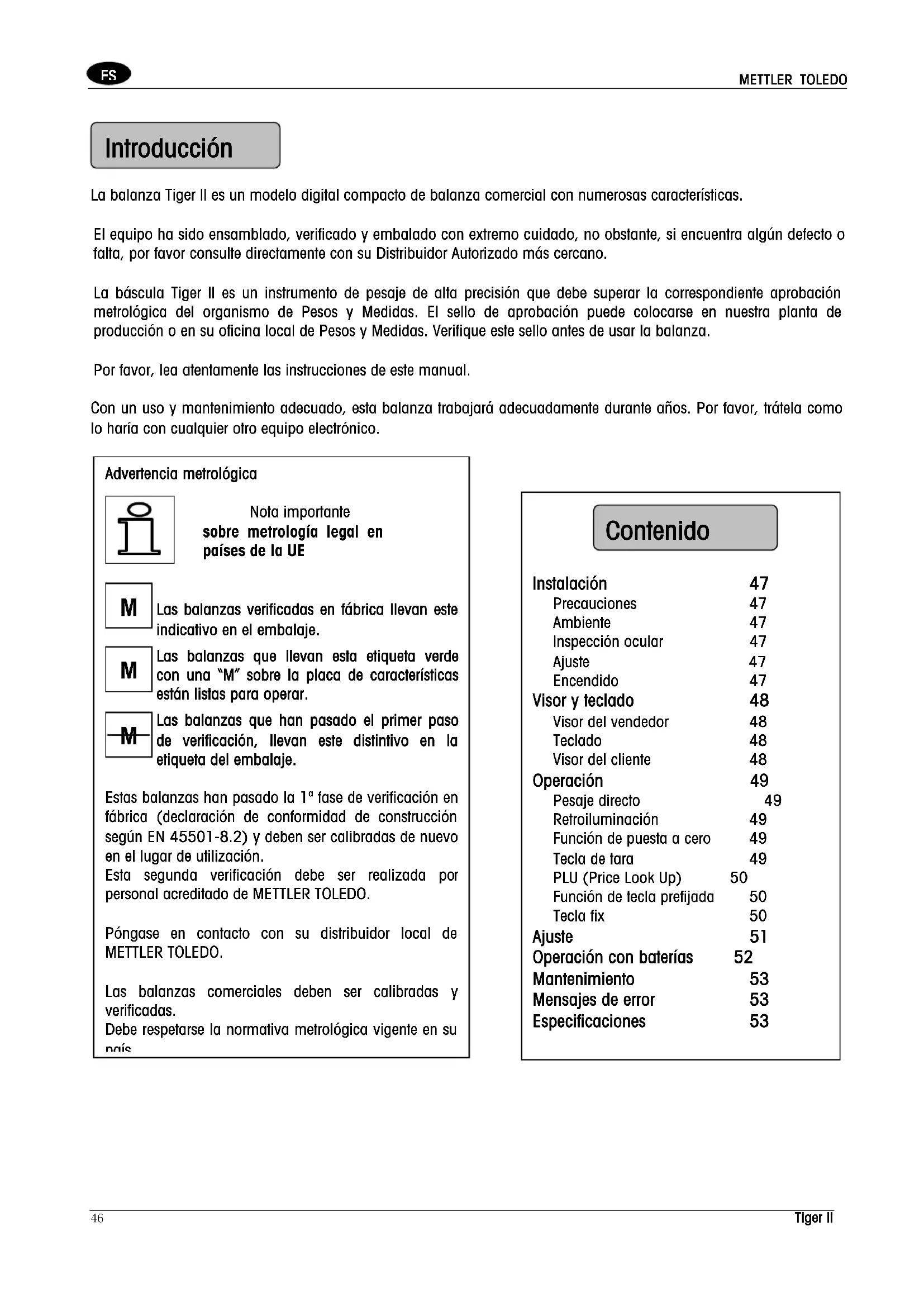 La balanza Tiger II es un modelo digital compacto de balanza comercial con numerosas características. El equipo ha sido ensamblado, verificado y embalado con extremo cuidado, no obstante, si encuentra algún defecto o falta, por favor consulte directamente con su Distribuidor Autorizado más cercano. La báscula Tiger II es un instrumento de pesaje de alta precisión que debe superar la correspondiente aprobación metrológica del organismo de Pesos y Medidas. El sello de aprobación puede colocarse en nuestra planta de producción o en su oficina local de Pesos y Medidas. Verifique este sello antes de usar la balanza. Por favor, lea atentamente las instrucciones de este manual. Con un uso y mantenimiento adecuado, esta balanza trabajará adecuadamente durante años. Por favor, trátela como lo haría con cualquier otro equipo electrónico.