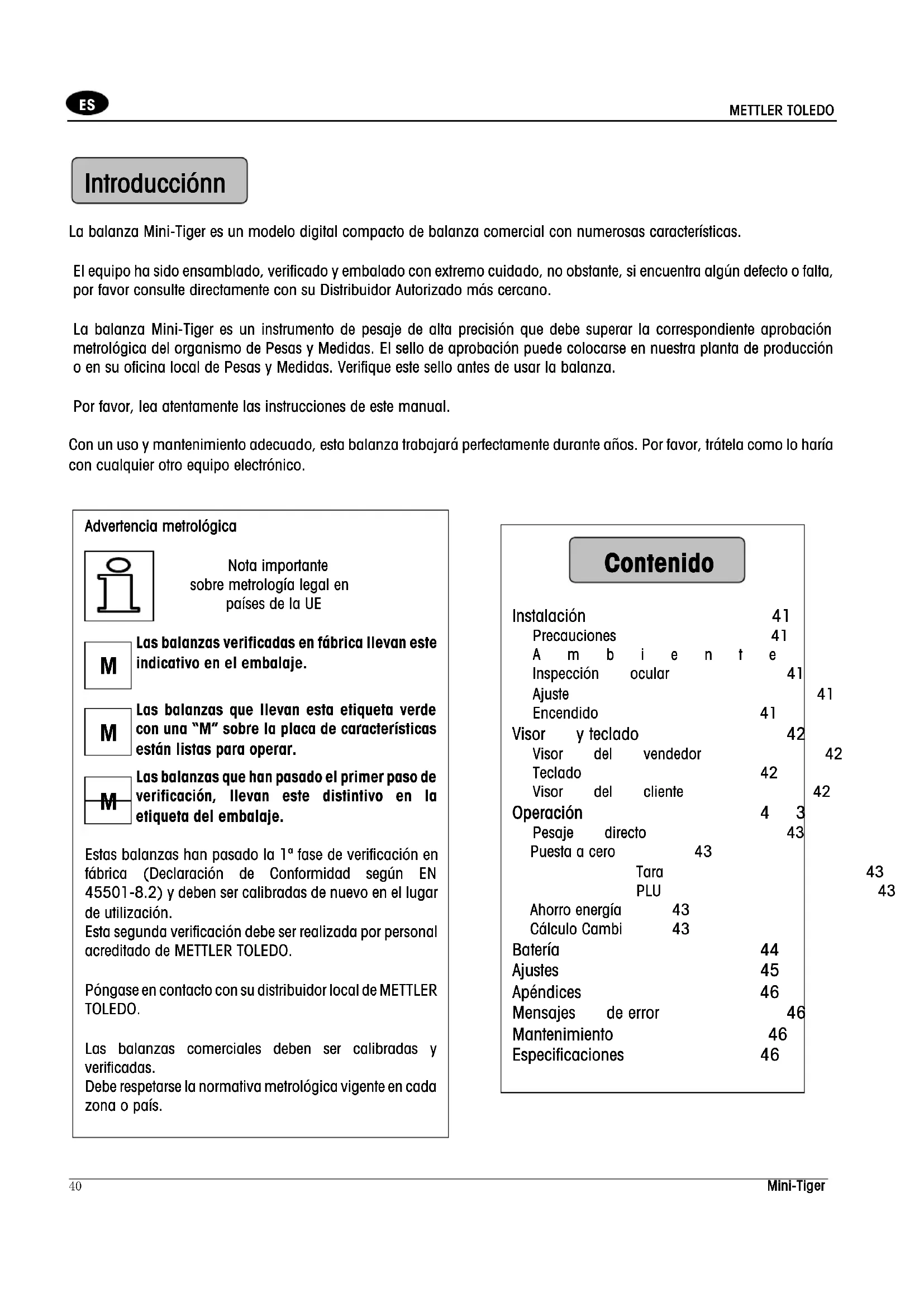 Instalación 41 Precauciones 41 Ambiente 41 Inspección ocular 41 Ajuste 41 Encendido 41 Visor y teclado 42 Visor del vendedor 42 Teclado 42 Visor del cliente 42 Operación 43 Pesaje directo 43 Puesta a cero 43 Tara 43 PLU 43 Ahorro energía 43 Cálculo Cambi 43 Batería 44 Ajustes 45 Apéndices 46 Mensajes de error 46 Mantenimiento 46 Especificaciones 46 ContenidoMETTLER TOLEDO Mini Tiger 41