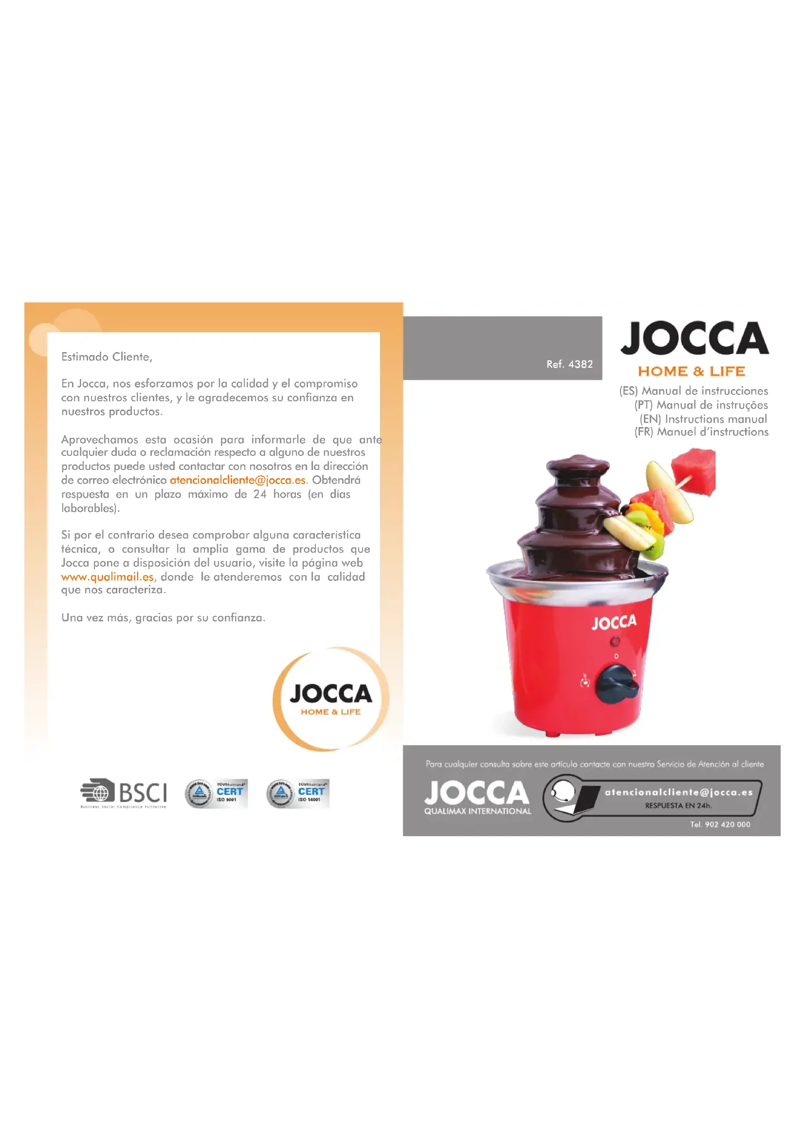 (ES) Manual de instrucciones (PT) Manual de instruções (EN) Instructions manual (FR) Manuel d’instructions Ref. 4382 Estimado Cliente, En Jocca, nos esforzamos por la calidad y el compromiso con nuestros clientes, y le agradecemos su confianza en nuestros productos. Aprovechamos esta ocasión para informarle de que ante cualquier duda o reclamación respecto a alguno de nuestros productos puede usted contactar con nosotros en la dirección de correo electrónico atencionalcliente@jocca.es. Obtendrá respuesta en un plazo máximo de 24 horas (en días laborables). Si por el contrario desea comprobar alguna característica técnica, o consultar la amplia gama de productos que Jocca pone a disposición del usuario, visite la página web www.qualimail.es, donde le atenderemos con la calidad que nos caracteriza. Una vez más, gracias por su confianza.FUENTE DE CHOCOLATE