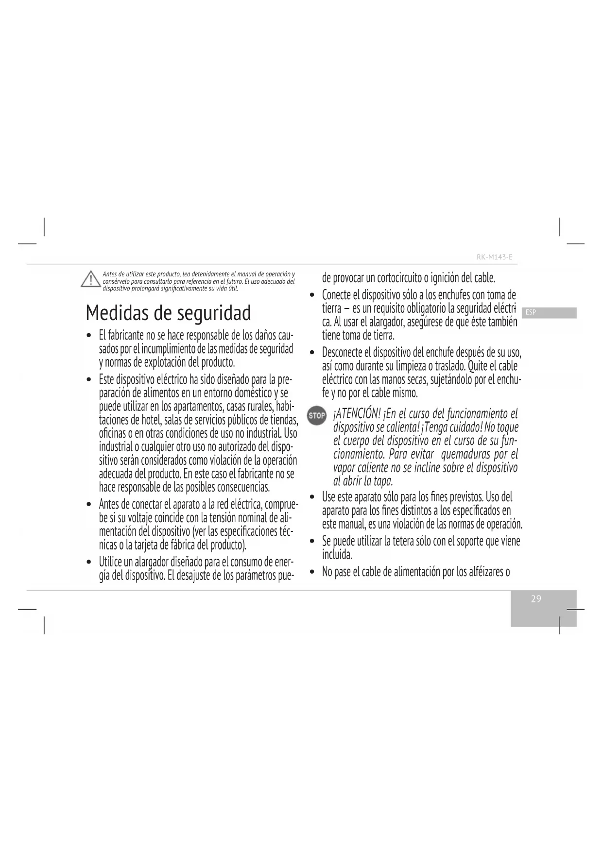 Desconecte el dispositivo del enchufe después de su uso, así como durante su limpieza o traslado. Quite el cable eléctrico con las manos secas, sujetándolo por el enchu- fe y no por el cable mismo. ¡ATENCIÓN! ¡En el curso del funcionamiento el dispositivo se calienta! ¡Tenga cuidado! No toque el cuerpo del dispositivo en el curso de su fun- cionamiento. Para evitar quemaduras por el vapor caliente no se incline sobre el dispositivo al abrir la tapa.