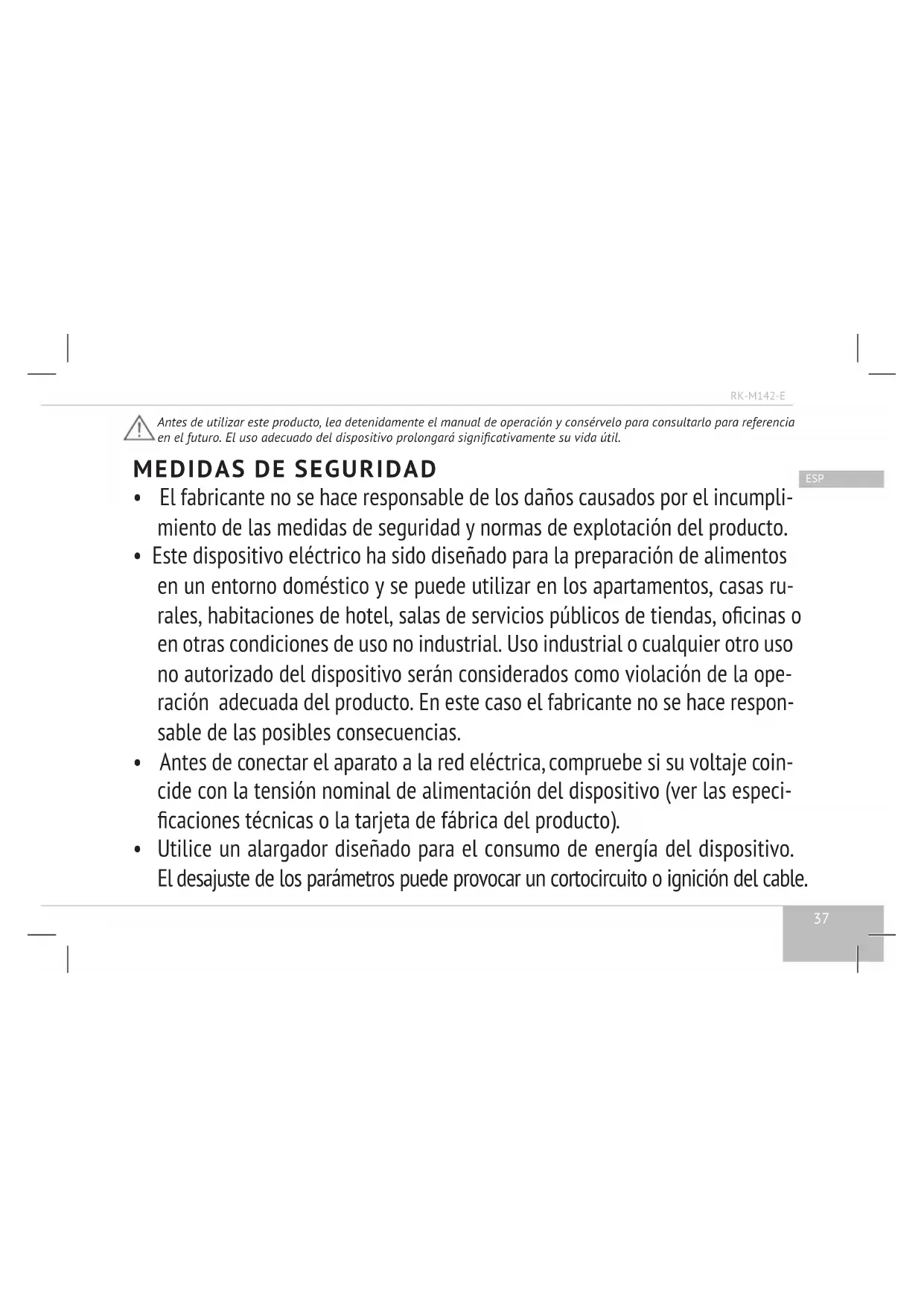 - No pase el cable de alimentación por los alféizares o cerca de las fuentes de calor. Asegúrese de que el cable no esté torcido o doblado, no entré en con-39 ESP RK-M142-E tacto con objetos, esquinas y bordes de muebles alados. RECUÉRDESE: los daños accidentales sufridos por el cable de alimentación pueden causar problemas que no corresponden a las condiciones de la garantía, así como pueden llevar a una descarga eléctrica. Un cable de alimentación dañado requie