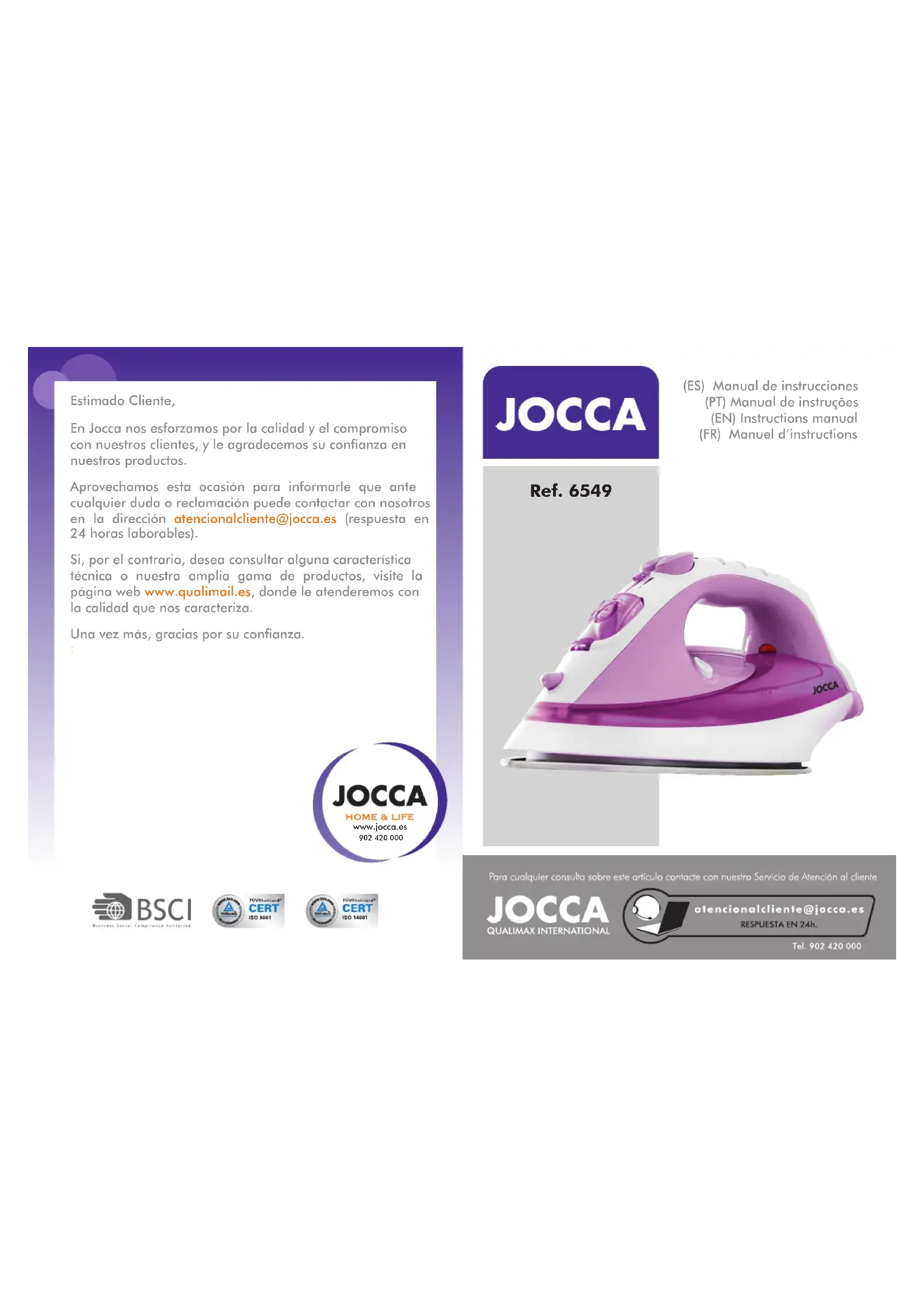 (ES) Manual de instrucciones (PT) Manual de instruções (EN) Instructions manual (FR) Manuel d’instructions Estimado Cliente, En Jocca nos esforzamos por la calidad y el compromiso con nuestros clientes, y le agradecemos su confianza en nuestros productos. Aprovechamos esta ocasión para informarle que ante cualquier duda o reclamación puede contactar con nosotros en la dirección atencionalcliente@jocca.es (respuesta en 24 horas laborables). Si, por el contrario, desea consultar alguna característica técnica o nuestra amplia gama de productos, visite la página web www.qualimail.es, donde le atenderemos con la calidad que nos caracteriza. Una vez más, gracias por su confianza.