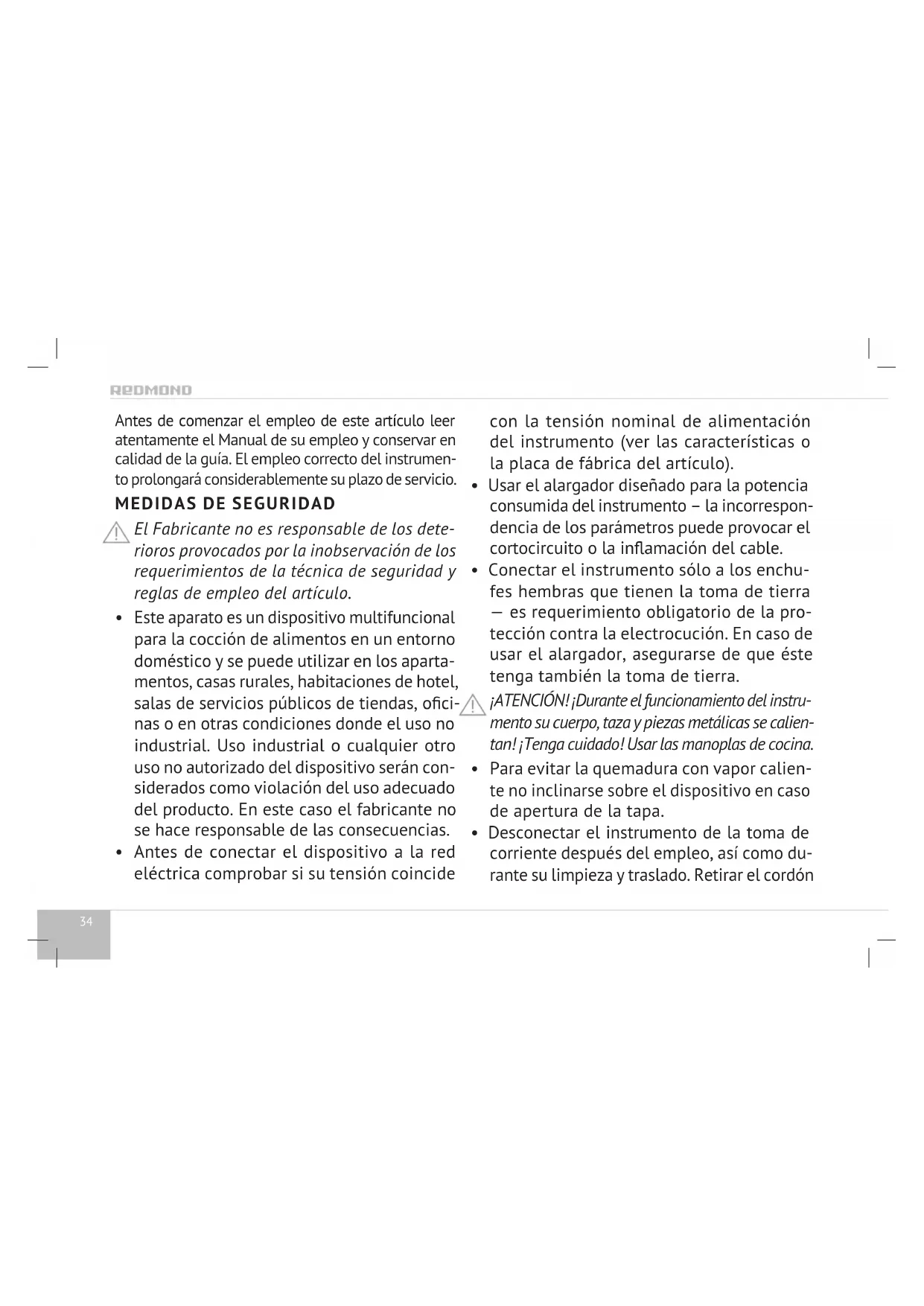 Desembalar cuidadosamente el artículo y retirarlo de la caja, eliminar todos los materiales de embalaje y etiquetas publicitarias excepto la etiqueta con el número de serie. La ausencia del número de serie en el artículo le priva automáticamente el derecho para su servicio de garantía.37 ESP RMC-PM4506E Si se cocinan a presión los platos líquidos o en forma de puré es necesario esperar 5-10 minutos para que el aparato se haya enfriado, y sólo después abrir la válvula. En caso contrario es posible escape del líquido caliente junto con el vapor que sale. ¡ATENCIÓN! Al abrirse la válvula de escape de vapor durante o después del proceso de la preparación es posible que tenga lugar un fuerte escape vertical del vapor caliente. ¡PELIGRO! Utilización del electrodoméstico en el modo de olla a presión Cuando la válvula de escape de vapor está cerrada, la cámara de operación se encuentra hermetizada, la presión en la cámara de operacion va en au- mento y se mantiene alta. A la vez, la tapa queda bloqueada. El robot de cocina – olla a presión REDMOND RMC-PM4506E está dotado del sistema de protección de niveles múltiples. Si las lecturas de tempera- tura y de la presión en la cámara de operación dejan de corresponder a los parámetros requeridos, el sistema va a parar el proceso de preparación. Cuando las lecturas se normalizan, el proceso de preparación se reanudará. Si los parámetros no se normalizan durante un lapso de tiempo demasiado, un dispositivo especial cortará el circuito de alimentación eléctrica para hacer parar la operación del robot de cocina – olla a vapor. ¡Atención! Se prohíbe en el modo de olla a presión la preparación si la cantidad del agua o de otro líquido en ella es inferior a 2 volúmenes del vaso calibrado. Se prohíbe en el modo de olla a presión freír en grasa productos a presión. Se puede pasar legumbres triturados en poca cantidad del óleo o de caldo ESTANDO SIEMPRE LA TAPA ABIERTA. Se prohíbe llenar de productos y agua la cubeta a más de 2/3 de su capa- cidad. Cuando cocinamos productos capaces de empaparse de humedad en el agua caliente e hincharse o de generar espuma (la espinaca, arroz, le- guminosas, macarrones, mantis, etc.), no debemos llenar la cubeta en más de 1/2 de su capacidad. Modo “Programador de inicio” Este modo nos permite aplazar el inicio del proceso de preparación a un plazo entre 30 minutos hasta 24 horas, con el paso de ajuste igual a 30 minutos. No se recomienda aplicar el modo del inicio retardado si forman parte del plato los productos alimenticios perecederos (huevos, leche fres- ca, carne, queso, etc.).
