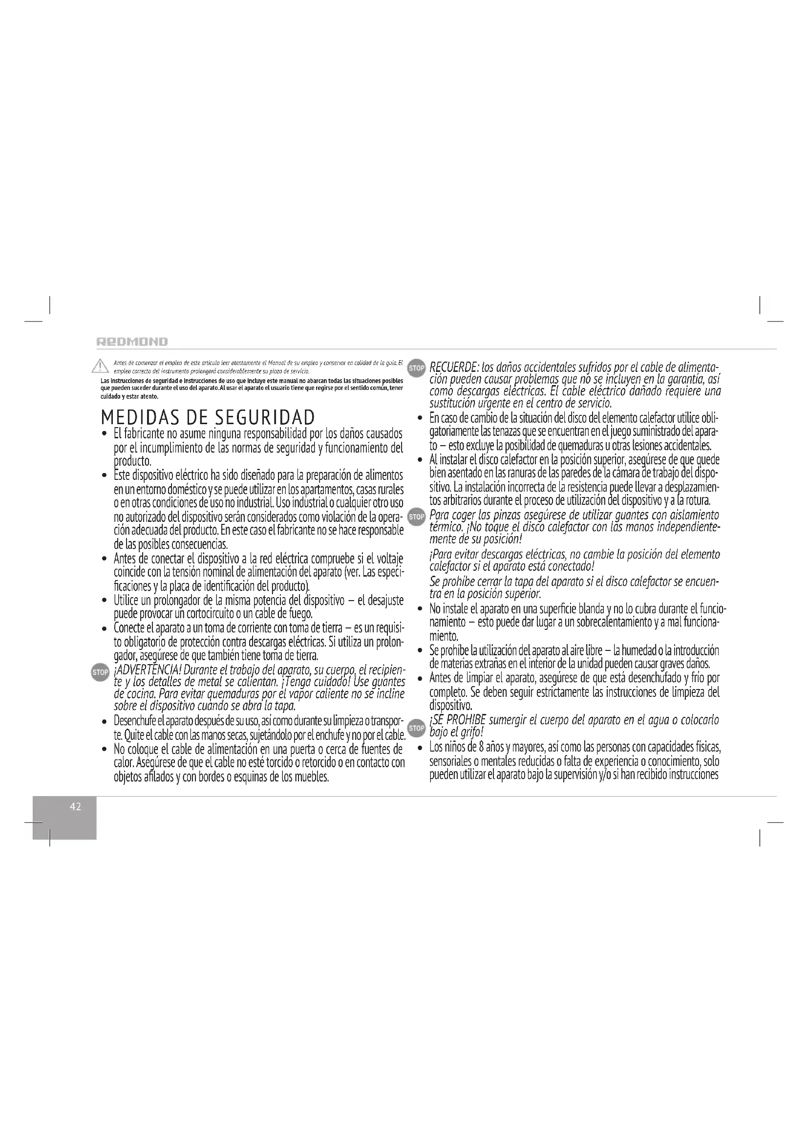 Conecte el aparato a un toma de corriente con toma de tierra — es un requisi- to obligatorio de protección contra descargas eléctricas. Si utiliza un prolon- gador, asegúrese de que también tiene toma de tierra. ¡ADVERTENCIA! Durante el trabajo del aparato, su cuerpo, el recipien- te y los detalles de metal se calientan. ¡Tenga cuidado! Use guantes de cocina. Para evitar quemaduras por el vapor caliente no se incline sobre el dispositivo cuando se abra la tapa.