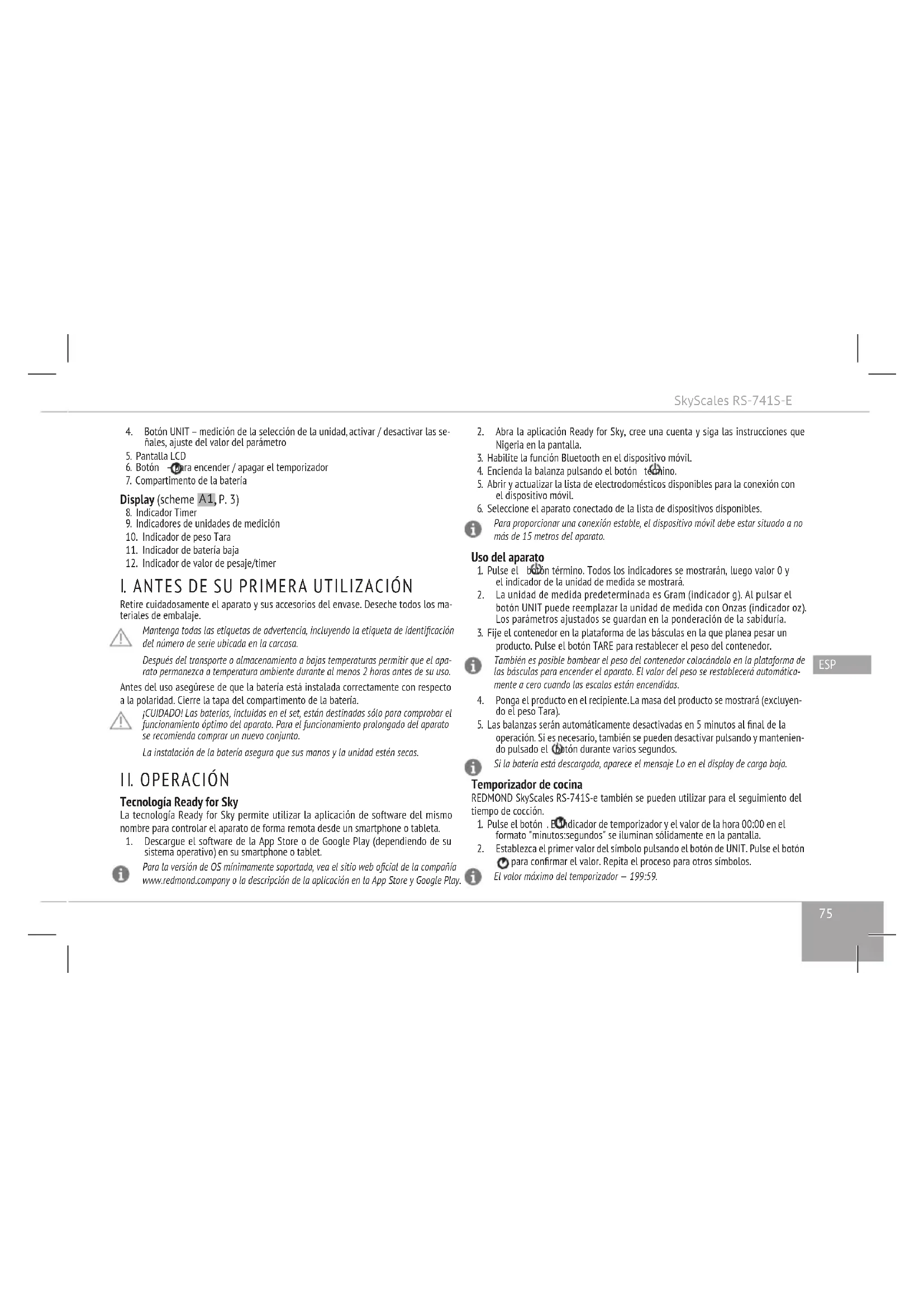 No utilice limpiadores abrasivos o a base de disolventes, esponjas metálicas, etc. Limpie la plataforma con un paño húmedo suave y limpie seco. No sumergir la unidad en agua ni lavarla con agua corriente. La balanza no es apta para Lavavajillas. Se aconseja retirar la batería, si la escala no está en uso durante mucho tiempo. Guar- de el aparato ensamblado en un lugar seco y ventilado lejos de los aparatos de Cale- facción y de la luz solar directa. Durante el transporte y el almacenamiento, no exponga el dispositivo a la tensión mecánica, que puede conducir al daño del dispositivo y / o a la violación de la integri- dad del paquete. Mantenga el envase del dispositivo alejado del agua y de otros líquidos. I V. ANTES DE CONTACTAR CON EL CENTRO DE SERVICIO Problema Posible causa Solución La balanza no trabajo La balanza no está encendida. Encienda el aparato pulsando el botón Problema Posible causa Solución La balanza no trabajo La batería está gastada Sustitúyase la pila según el procedimiento indicado en la sección "Antes de funcionar". El display muestra un men- saje de error: Lo Las lecturas de peso son inexactas Ha seleccionado la unidad de medida equivocada Seleccione la unidad de medida deseada No siguió el procedimiento de pesaje recomendado Coloque siempre la escala en una supercie plana y horizon- tal La unidad se apaga au- tomáticamente Función desactivación au- tomática activada La escala se apaga automática- mente después de su uso en 5 minutos El intento de sincroniza- ción o transferencia del ata desde el aparato al dispo- sitivo móvil falló La función Bluetooth en el dispositivo móvil está desha- bilitada Habilitar la función Bluetooth en el dispositivo móvil Ready for Sky app en el dispo- sitivo móvil is deactivate Ejecute la aplicación Ready for Sky en el dispositivo móvil Las Básculas de Cocina y el dispositivo móvil están muy lejos el uno del otro o hay desviaciones para la señal de radio Garantizar que la distancia entre los dispositivos no supere los 15 metros y que no haya desvíos para la transmisión de la señal de radio En caso de no conducir para eliminar los defectos, por favor, consulte el centro de Servicio autorizado. ¡NOTA! En caso de que se produzca un fallo en el funcionamiento de la aplicación Listo para el Cielo, no es obligatorio aplicar al centro de Servicio. Aplique al Servicio de asistencia técnica de REDMOND y obtenga la consulta de nuestros especialistas sobre la eliminación de errores y / o fallos en operación Ready for Sky. Sus comentarios y sugerencias sobre el funcionamiento de la aplicación se tendrán en cuenta en laSkyScales RS-741S-E