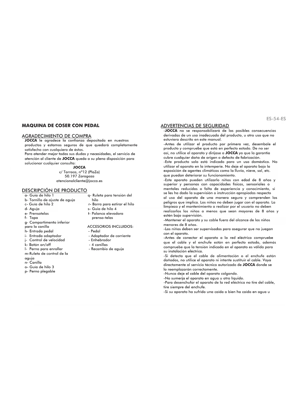 (ES) Manual de instrucciones (PT) Manual de instruções (EN) Instructions manual (FR) Manuel d’instructions (DE) Gebrauchsanweisung (NL) Gebruiksaanwijzing (IT) Istruzioni per l’use Ref. 6642 Estimado Cliente, En Jocca, nos esforzamos por la calidad y el compromiso con nuestros clientes, y le agradecemos su confianza en nuestros productos. Aprovechamos esta ocasión para informarle de que ante cualquier duda o reclamación respecto a alguno de nuestros productos puede usted contactar con nosotros en la dirección de correo electrónico atencionalcliente@jocca.es. Obtendrá respuesta en un plazo máximo de 24 horas (en días laborables). Si por el contrario desea comprobar alguna característica técnica, o consultar la amplia gama de productos que Jocca pone a disposición del usuario, visite la página web www.qualimail.es, donde le atenderemos con la calidad que nos caracteriza. Una vez más, gracias por su confianza.DESCRIPCIÓN/DESCRIÇÃO/DESCRIPTION/ DESCRIPTION/BESCHREIBUNG/ BESCHRIJVING/DESCRIZIONE Sentido del enhebrado How to thread correctly Sentido do enado Sens de l’enléMAQUINA DE COSER CON PEDAL