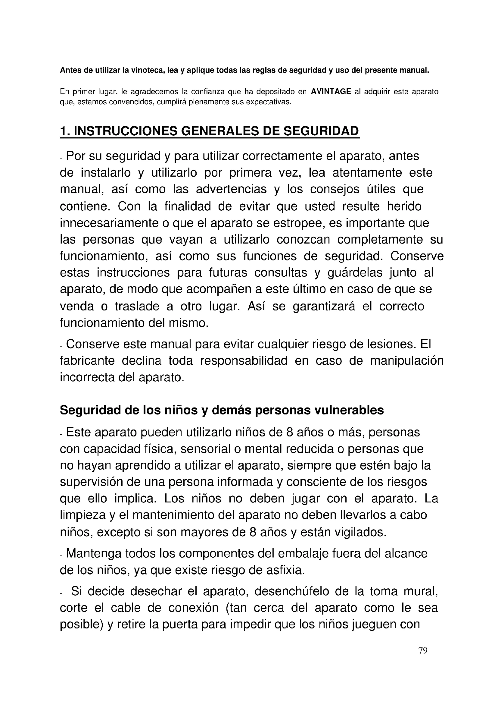 Dit apparaat is uitsluitend bedoeld om wijn te bewaren.79 Antes de utilizar la vinoteca, lea y aplique todas las reglas de seguridad y uso del presente manual. En primer lugar, le agradecemos la confianza que ha depositado en AVINTAGE al adquirir este aparato que, estamos convencidos, cumplirá plenamente sus expectativas.