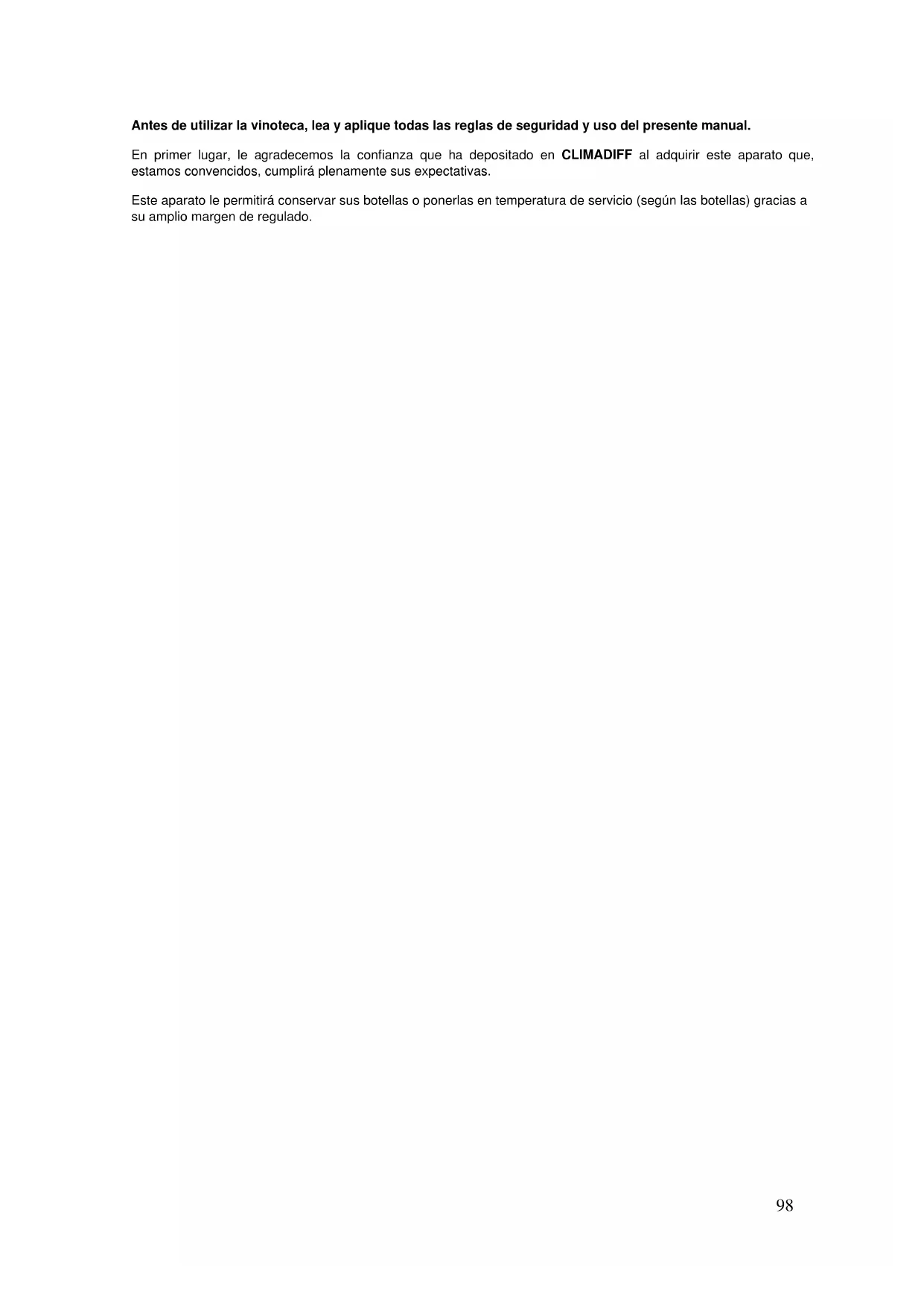 Desconecte el aparato antes de realizar cualquier operación de mantenimiento o limpieza (desconecte la clavija del cable de alimentación o el cortacircuitos correspondiente en función del modelo). No limpie el aparato con productos inflamables. No almacene ni vaporice gases o líquidos inflamables cerca del aparato.101 Antes de tirar la vinoteca en un lugar previsto para su reciclaje, retire la puerta y deje las bandejas en su lugar de manera que los niños tengan difícil acceder al interior. En caso de que se incumplan las instrucciones de conexión o utilización, la responsabilidad de Climadiff no se vería comprometida por los daños que pudieran derivarse.