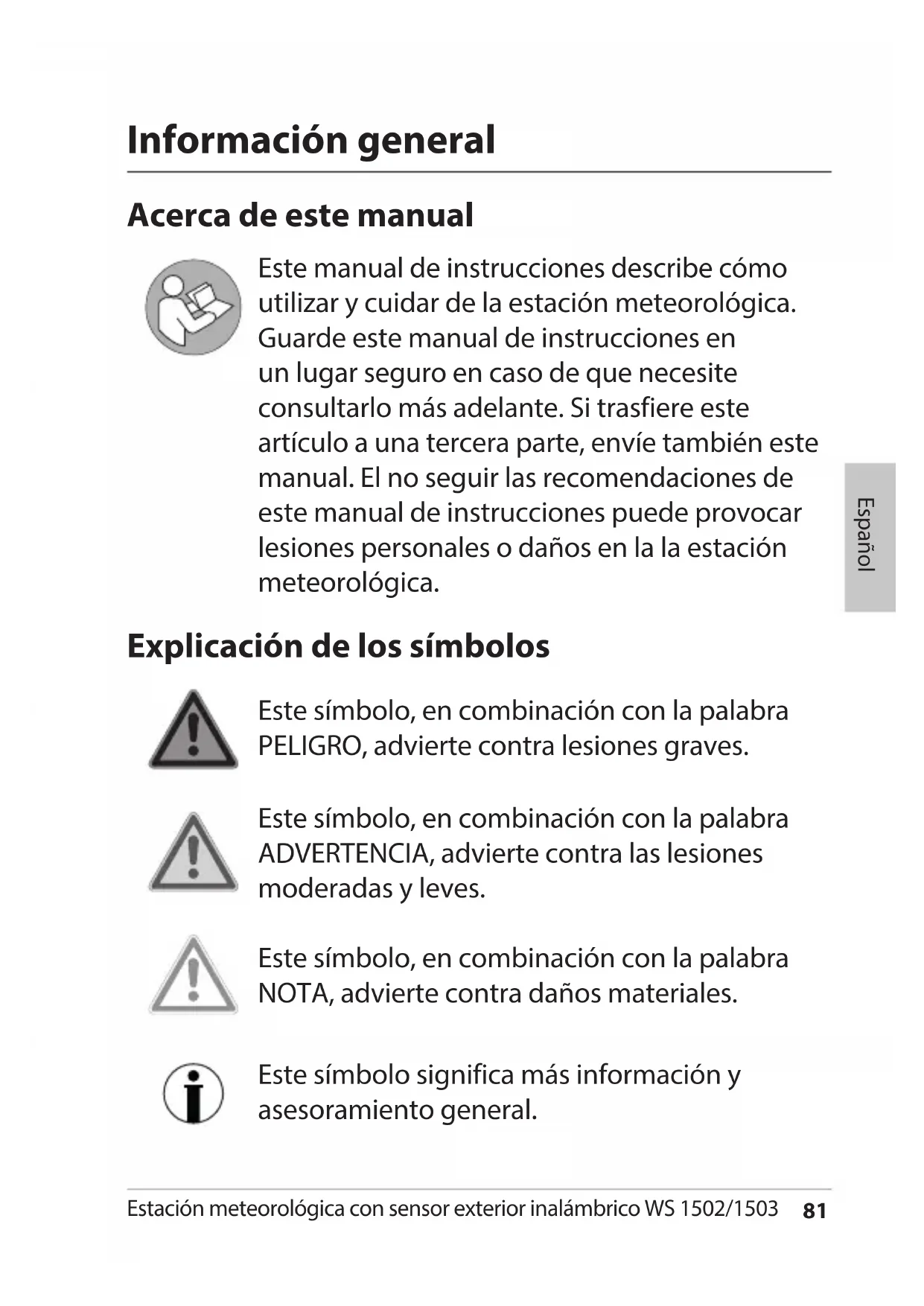 Este manual de instructuciones describe como utiliser y cuidar de la estación meteorológica. Guarde este manual de instructaciones en un lugar seguro en caso de que necesite consultarlo más adelante. Si trasfiere este articulo a una tercera parte, envie también estemanual. El no seguir las recomendaciones de este manual de instructaciones puede provocar lesiones personales o daños en la la estación meteorológica.