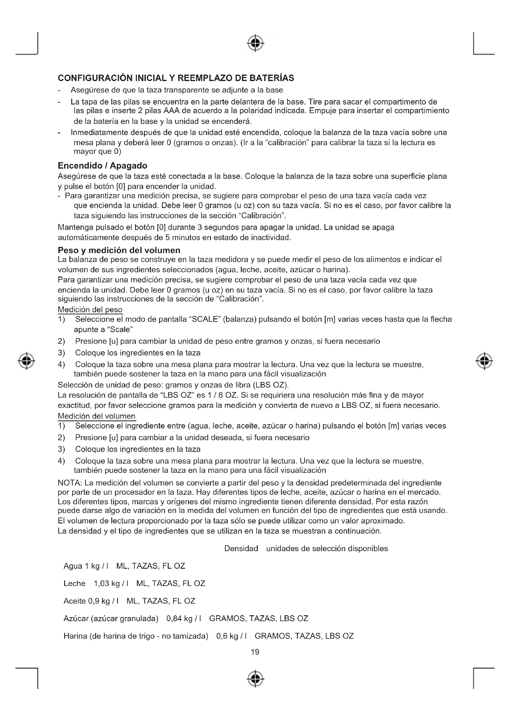 también puede sostener la taza en la mano para una fácil visualización NOTA:Lamedicióndelvolumenseconvierteapartirdelpesoyladensidadpredeterminadadelingrediente por parte de un procesador en la taza. Hay diferentes tipos de leche, aceite, azúcar o harina en el mercado. Losdiferentestipos,marcasyorígenesdelmismoingredientetienendiferentedensidad.Porestarazón puededarsealgodevariaciónenlamedidadelvolumenenfuncióndeltipodeingredientesqueestáusando. Elvolumendelecturaproporcionadoporlatazasólosepuedeutilizarcomounvaloraproximado. Ladensidadyeltipodeingredientesqueseutilizanenlatazasemuestranacontinuación. Densidad unidades de selección disponibles Agua 1kg/l ML,TAZAS,FLOZ Leche 1,03kg/l ML,TAZAS,FLOZ Aceite 0,9kg/l ML,TAZAS,FLOZ Azúcar(azúcargranulada) 0,84kg/l GRAMOS,TAZAS,LBSOZ Harina(deharinadetrigo-notamizada) 0,6kg/l GRAMOS,TAZAS,LBSOZ20 Laresolucióndepantallade“FLOZ”y“TAZAS”es1/8.Siserequirieraunaresoluciónmásnaydemayor exactitud,porfavorseleccioneml(ogramos)paralamediciónyconviertadenuevoaFLOZoTAZASsies necesario. FuncióndeTara(puestaacero) Esfácilyconvenientedecrearymezclardiferentesingredientesenunamismataza.Despuésdequeel primer ingrediente se añada y se mida, se podrá agregar otro ingrediente después de realizar la función de tara a continuación. - Coloqueelrecipienteconelingredienteporprimeravezenunamesaplana - Pulseelbotón[0]unavez.Lalecturaseponeaceroyeliconode“TARE”(TARA)permaneceráenla pantalla superior Ahora usted podrá agregar su ingrediente adicional. Sólo se mide el peso o volumen del último ingrediente agregado. Continúe con el procedimiento anterior para componer los diferentes ingredientes de su receta. NOTA:Lafuncióndetarasólofuncionacorrectamentesilatazasecolocasobreunasupercieplana Función de Tara invertida Inmediatamentedespuésdelafuncióndetaraseharealizadoylapantallamuestra“0”coneliconode “TARE”,ustedpuedepulsarelbotón[0]parareanudarelpesooelvolumenoriginaldelecturaaligualque antesdelafuncióndetaraeiconode“TARE“desaparecerá. NOTA:Lafuncióndetarainvertidasólofuncionasilatazasecolocasobreunasupercieplana MEZCLA(NOTAIMPORTANTE) Mezclardiferentesingredientesenelrecipientedelabásculaesfácilycómodo.Puederesistirhasta5kgde cargamáxima.Cuandoelpesototalylafuerzadurantelamezclasonsuperioresa5kg,launidademitiráun pitidoymostraráelmensaje“Err”.Asegúresedequitarpesoydetenerlaaccióndemezclainmediatamente. Loscomponentessensiblesalpesoseencuentranenlabasedelabásculayunpesoyfuerzaexcesivos aplicados a la base podrían dañar permanentemente el interior de la báscula y ofrecer lecturas inexactas. Para prolongar la vida del producto, por favor, extraiga el recipiente de la base y mezcle los ingredientes en el recipienteindividualcuandolacargaseaproximeoseasuperiora5kg.