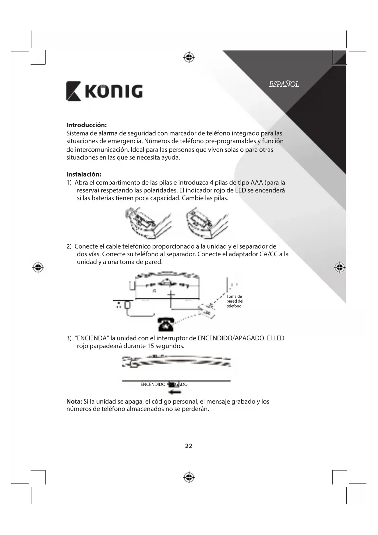 Introducción: Sistema de alarma de seguridad con marcador de teléfono integrado para las situaciones de emergencia. Números de teléfono pre-programables y función de intercomunicación. Ideal para las personas que viven solas o para otras situaciones en las que se necesita ayuda. Instalación: