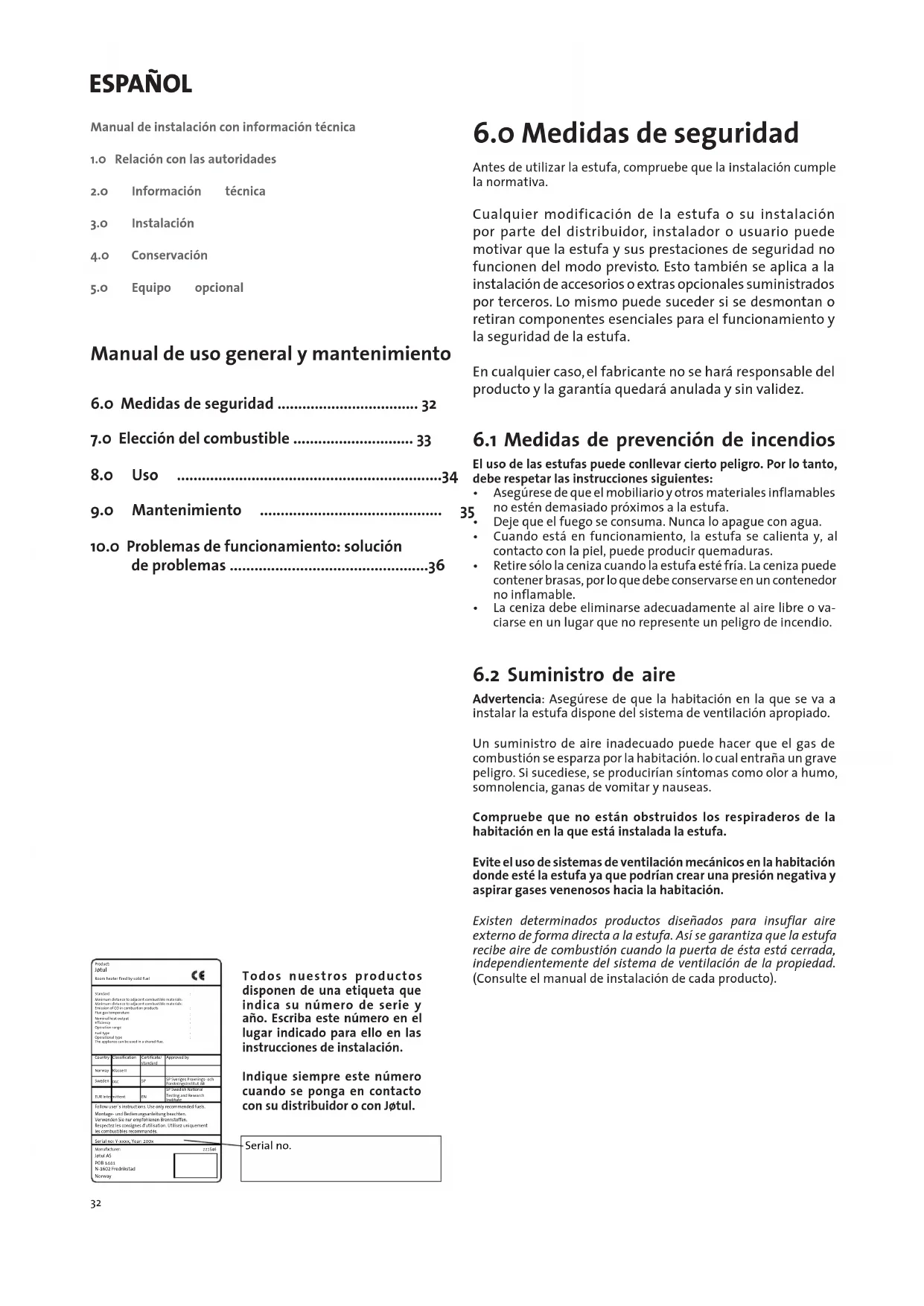 Serial no. Todos nuestros productos disponen de una etiqueta que indica su número de serie y año. Escriba este número en el lugar indicado para ello en las instrucciones de instalación. Indique siempre este número cuando se ponga en contacto con su distribuidor o con Jøtul. ESPAÑOL