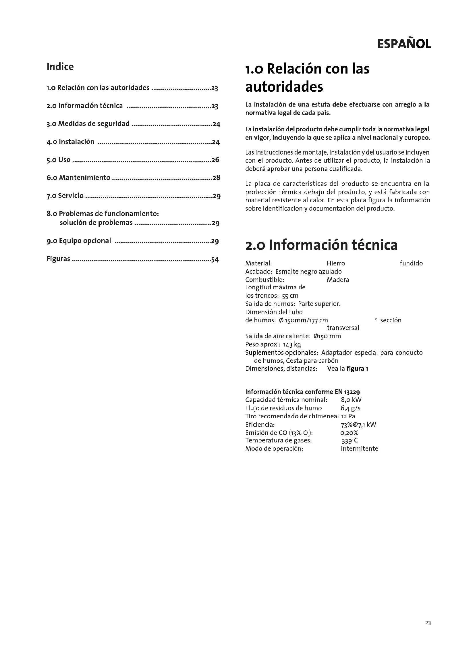 • La estufa se pueda conectar a una chimenea y a un tubo de humo aprobados para estufas de combustibles solidos con las temperatas de gas de humo especificada en «2.0 Informacion技术水平ica».