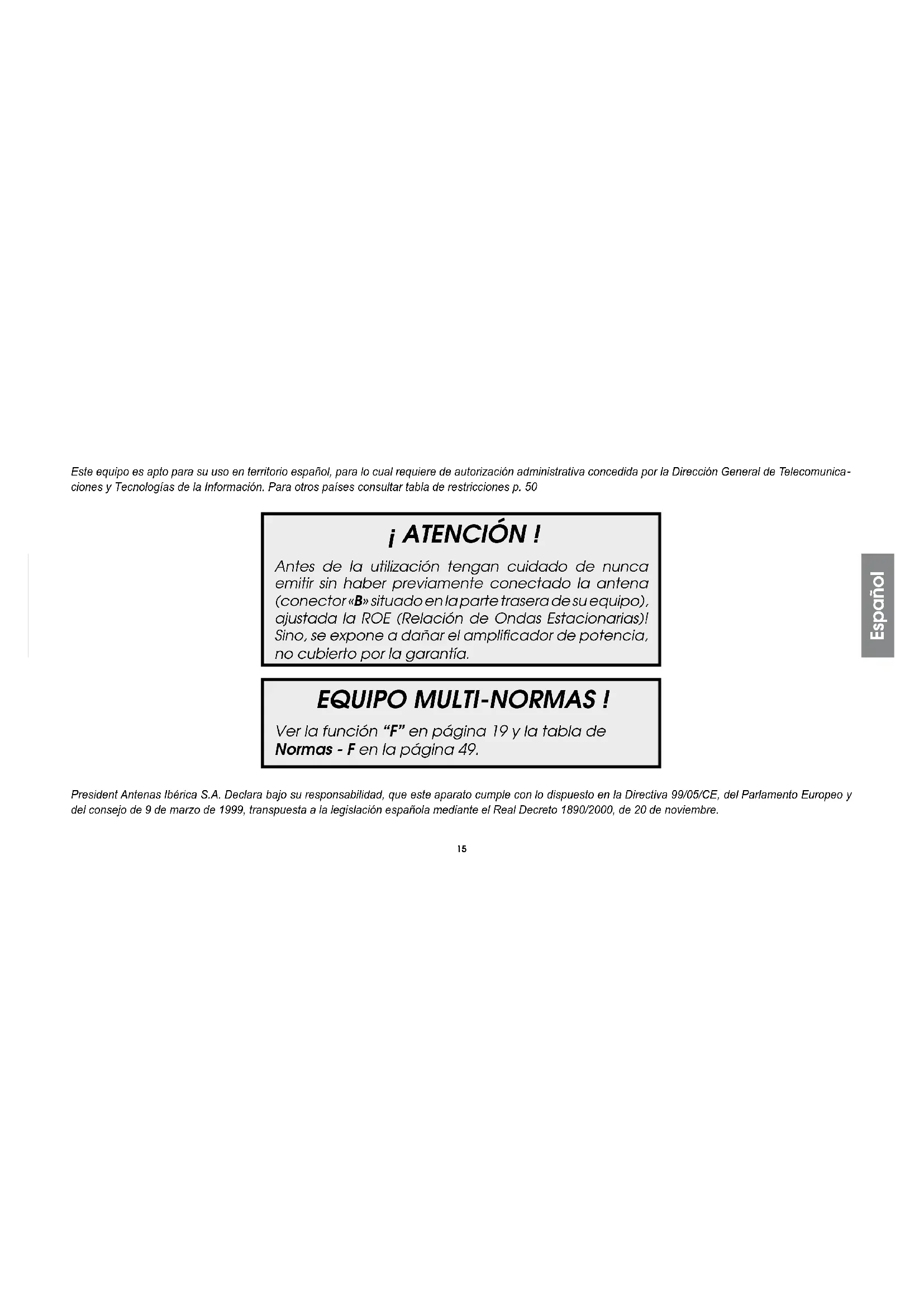 Le Service Qualité15 Español President Antenas Ibérica S.A. Declara bajo su responsabilidad, que este aparato cumple con lo dispuesto en la Directiva 99/05/CE, del Parlamento Europeo y del consejo de 9 de marzo de 1999, transpuesta a la legislación española mediante el Real Decreto 1890/2000, de 20 de noviembre. Este equipo es apto para su uso en territorio español, para lo cual requiere de autorización administrativa concedida por la Dirección General de Telecomunica
