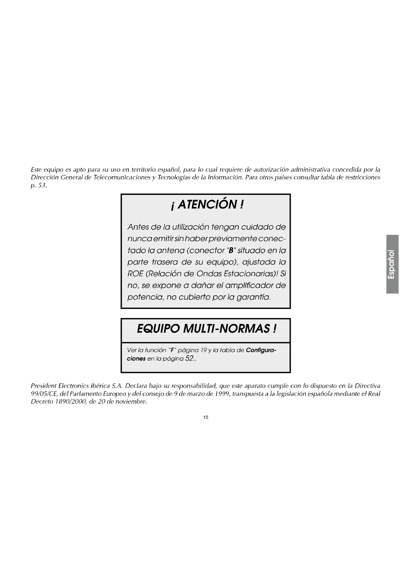 President Electronics Ibérica S.A. Declara bajo su responsabilidad, que este aparato cumple con lo dispuesto en la Directiva 99/05/CE, del Parlamento Europeo y del consejo de 9 de marzo de 1999, transpuesta a la legislación española mediante el Real Decreto 1890/2000, de 20 de noviembre. Este equipo es apto para su uso en territorio español, para lo cual requiere de autorización administrativa concedida por la Dirección General de Telecomunicaciones y Tecnologías de la Información. Para otros países consultar tabla de restricciones p. 53. ¡ ATENCIÓN ! Antes de la utilización tengan cuidado de nunca emitir sin haber previamente conec- tado la antena (conector "B" situado en la parte trasera de su equipo), ajustada la ROE (Relación de Ondas Estacionarias)! Si no, se expone a dañar el amplificador de potencia, no cubierto por la garantía. EQUIPO MULTI-NORMAS ! Ver la función “F” página 19 y la tabla de Configura- ciones en la página