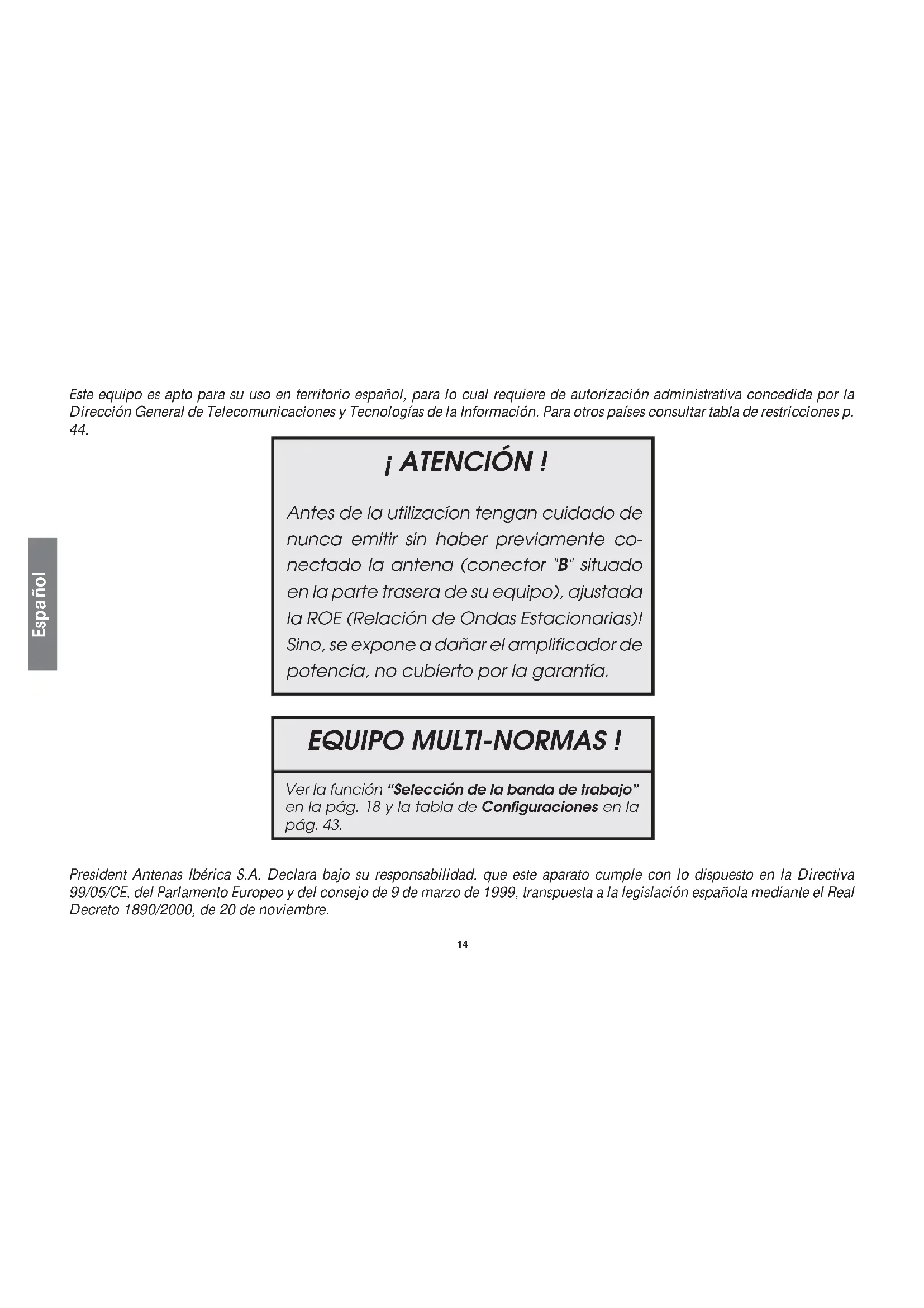 Date d’achat : .......................................................................................... Type : radio CB KENJI EMPEROR N° de série : ............................................................................................14 Español ¡ ATENCIÓN ! Antes de la utilizacíon tengan cuidado de nunca emitir sin haber previamente co- nectado la antena (conector "B" situado en la parte trasera de su equipo), ajustada la ROE (Relación de Ondas Estacionarias)! Sino, se expone a dañar el amplificador de potencia, no cubierto por la garantía. President Antenas Ibérica S.A. Declara bajo su responsabilidad, que este aparato cumple con lo dispuesto en la Directiva 99/05/CE, del Parlamento Europeo y del consejo de 9 de marzo de 1999, transpuesta a la legislación española mediante el Real Decreto 1890/2000, de 20 de noviembre. Este equipo es apto para su uso en territorio español, para lo cual requiere de autorización administrativa concedida por la Dirección General de Telecomunicaciones y Tecnologías de la Información. Para otros países consultar tabla de restricciones p.