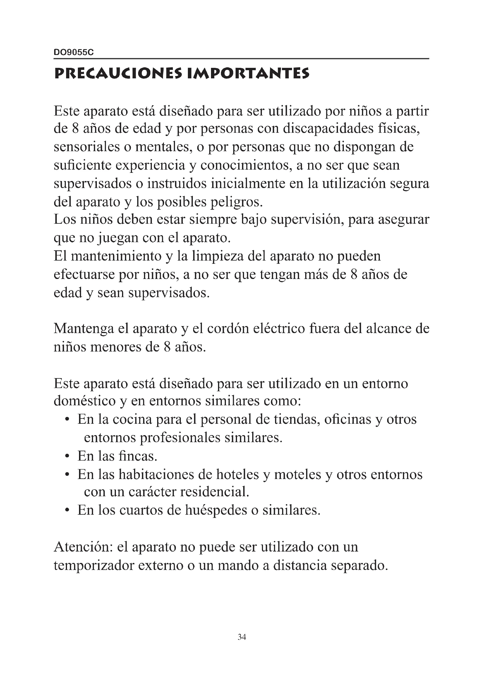 Este aparato está Diseñado para ser utilisé por niños a partir de 8 años de edad y por personas con discapacidades fisicas, sensoriales o mentales, o por personas que no dispongan de suficiente experiencia y conocimientos, a no ser que Sean supervisados o instruidos inicialmente en la Utilización segura del aparato y los posiblespeligros.