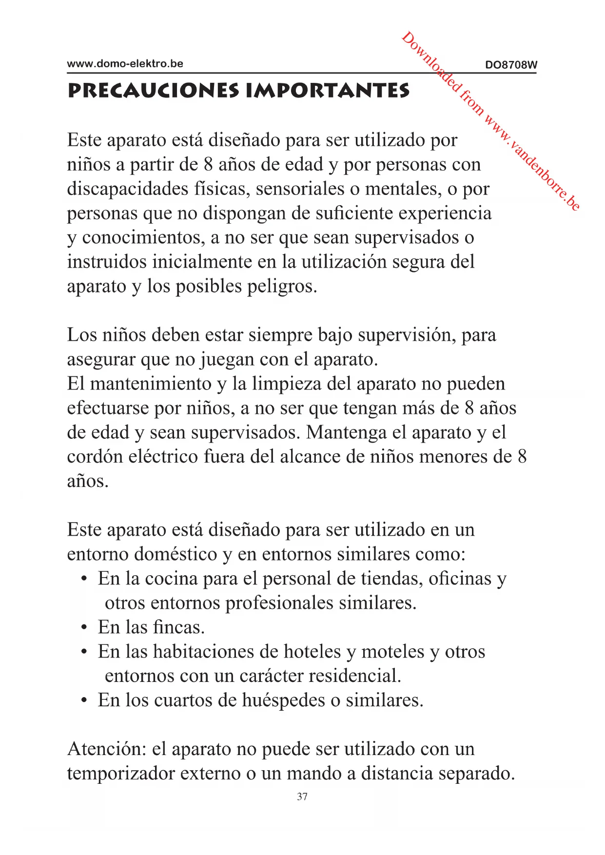 - Todos los daños y/o lesiones causados por el incumplimiento de estas instrucciones son bajo su propio riesgo. Ni el fabricante ni el importador Downloaded from www.vandenborre.beDO8708W