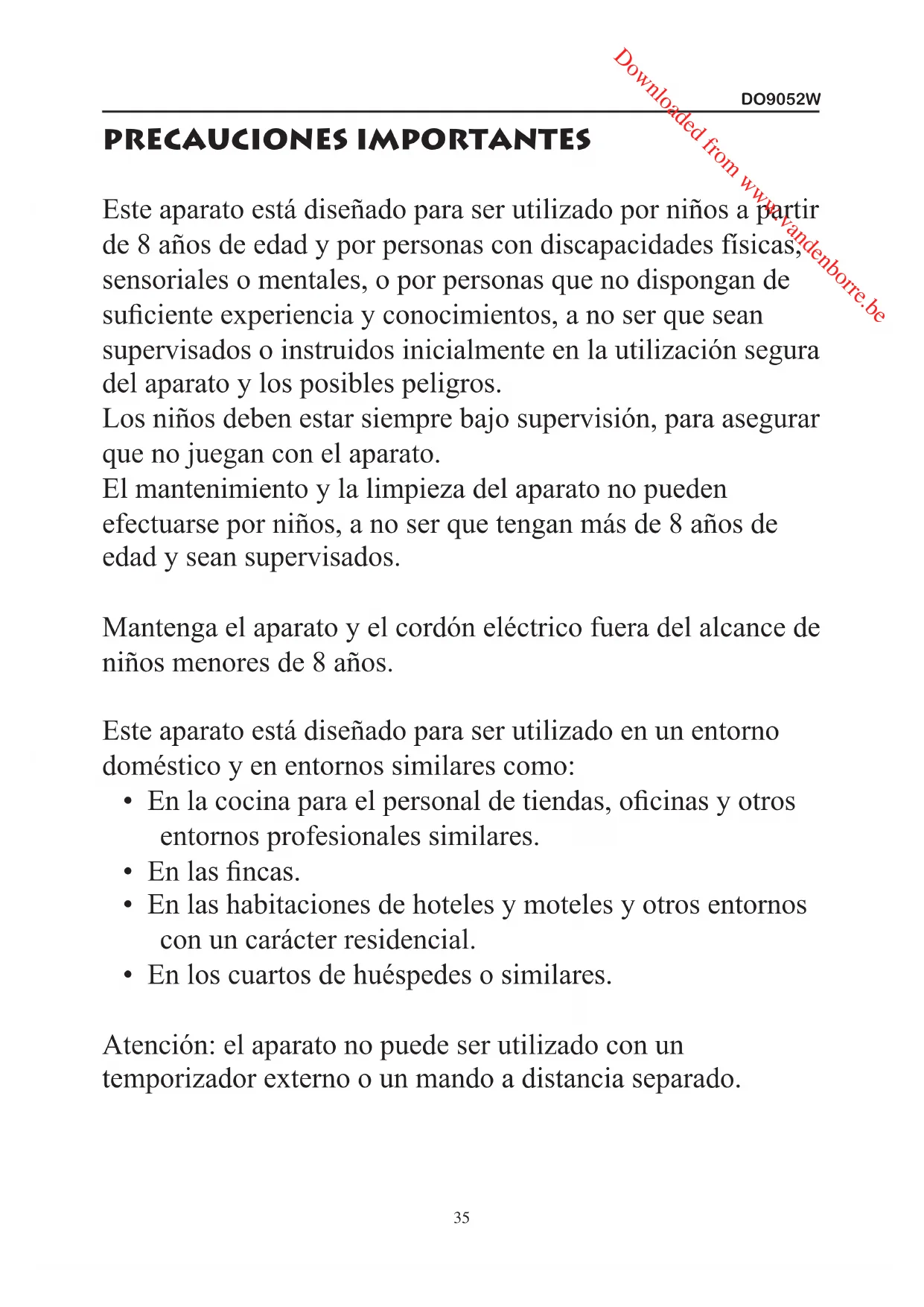 - En los cuartos de huéspedes o similares. Atención: el aparato no puede ser utilizado con un temporizador externo o un mando a distancia separado. Downloaded from www.vandenborre.beDO9052W