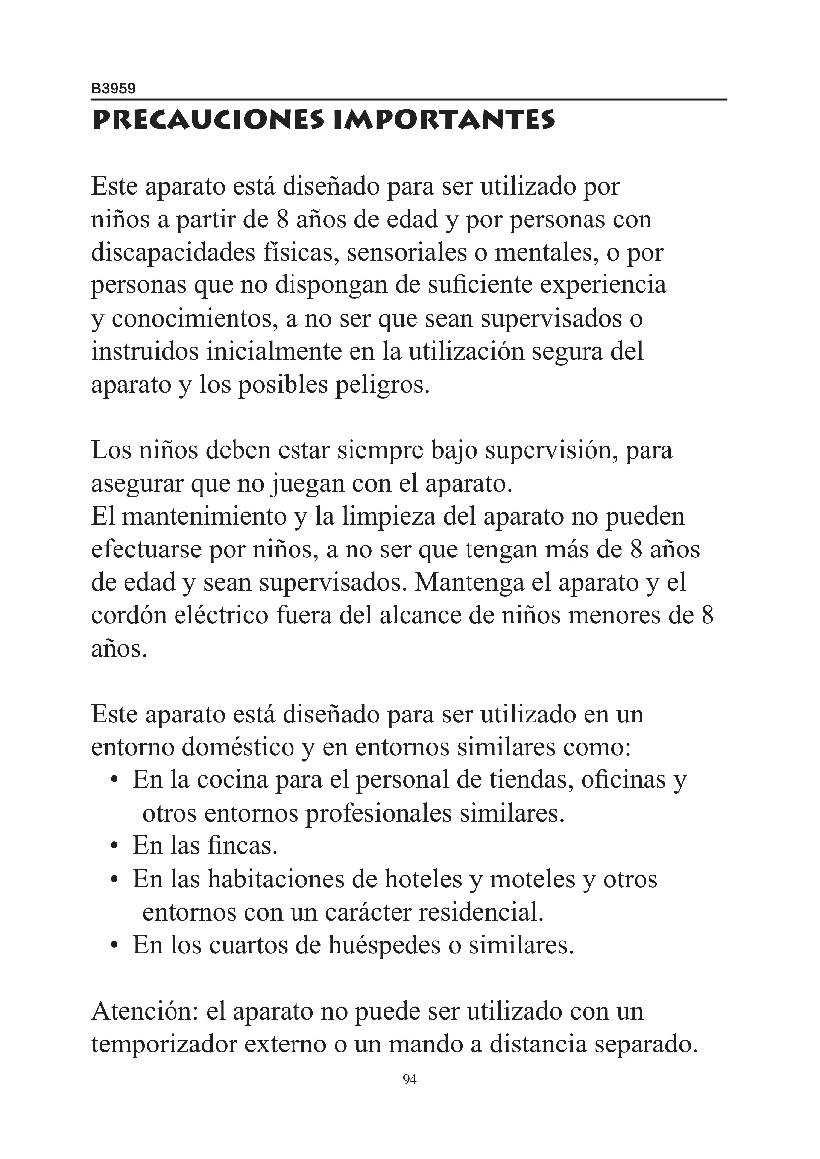 PRECAUCIONES IMPORTANTES Este aparato está diseñado para ser utilizado por niños a partir de 8 años de edad y por personas con discapacidades físicas, sensoriales o mentales, o por personas que no dispongan de suciente experiencia y conocimientos, a no ser que sean supervisados o instruidos inicialmente en la utilización segura del aparato y los posibles peligros. Los niños deben estar siempre bajo supervisión, para asegurar que no juegan con el aparato. El mantenimiento y la limpieza del aparato no pueden efectuarse por niños, a no ser que tengan más de 8 años de edad y sean supervisados. Mantenga el aparato y el cordón eléctrico fuera del alcance de niños menores de 8 años. Este aparato está diseñado para ser utilizado en un entorno doméstico y en entornos similares como: