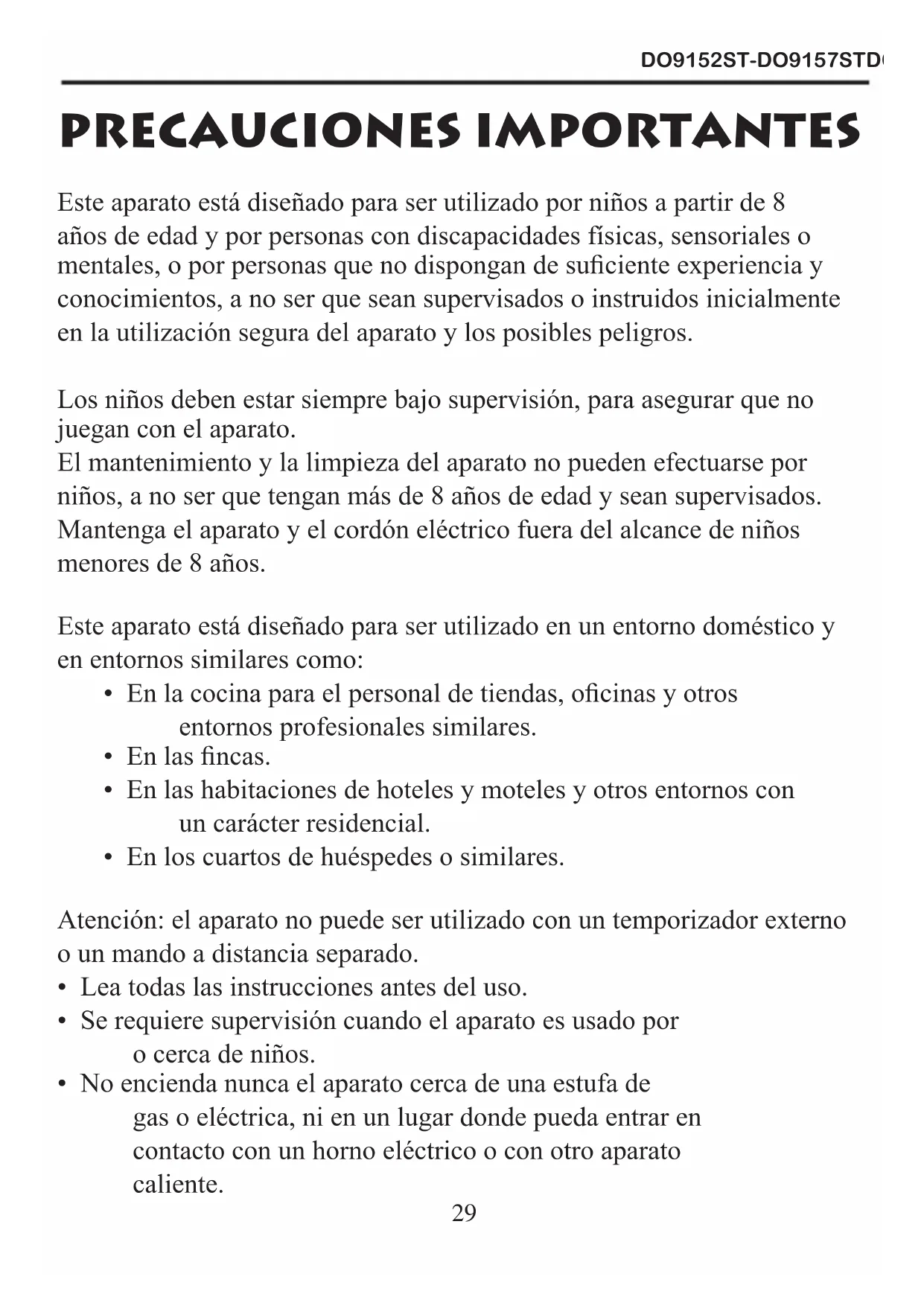 PRECAUCIONES IMPORTANTES Este aparato está diseñado para ser utilizado por niños a partir de 8 años de edad y por personas con discapacidades físicas, sensoriales o mentales, o por personas que no dispongan de suciente experiencia y conocimientos, a no ser que sean supervisados o instruidos inicialmente en la utilización segura del aparato y los posibles peligros. Los niños deben estar siempre bajo supervisión, para asegurar que no juegan con el aparato. El mantenimiento y la limpieza del aparato no pueden efectuarse por niños, a no ser que tengan más de 8 años de edad y sean supervisados. Mantenga el aparato y el cordón eléctrico fuera del alcance de niños menores de 8 años. Este aparato está diseñado para ser utilizado en un entorno doméstico y en entornos similares como: