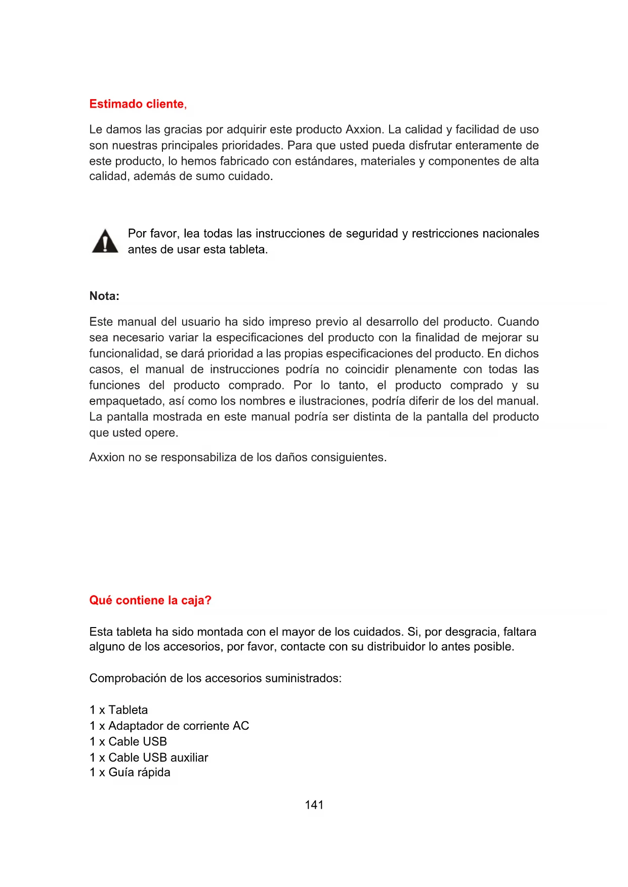 Esta tableta ha sido montada con el mayor de los cuidados. Si, por desgracia, falta algo delles accesorios, por favor, contacte con su distribuidor lo antes possible.