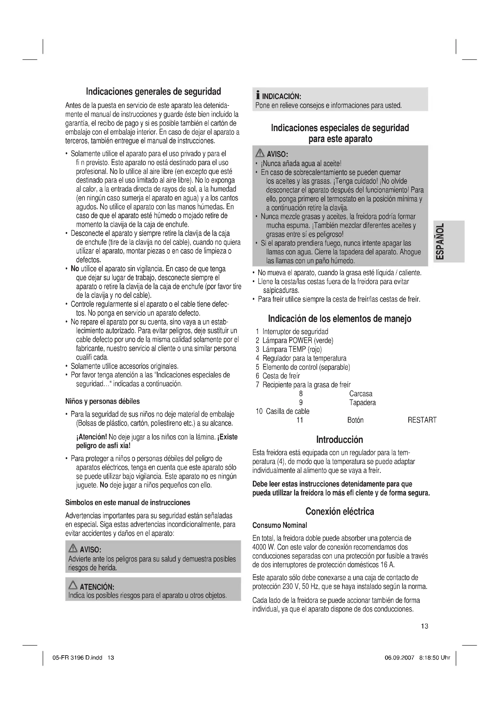 - Para freír utilice siempre la cesta de freír/las cestas de freír. Indicación de los elementos de manejo 1 Interruptor de seguridad 2 Lámpara POWER (verde) 3 Lámpara TEMP (rojo) 4 Regulador para la temperatura 5 Elemento de control (separable) 6 Cesta de freír 7 Recipiente para la grasa de freír 8 Carcasa 9 Tapadera 10 Casilla de cable 11 Botón RESTART Introducción Esta freidora está equipada con un regulador para la tem- peratura (4), de modo que la temperatura se puede adaptar individualmente al alimento que se vaya a freír. Debe leer estas instrucciones detenidamente para que pueda utilizar la freídora lo más efi ciente y de forma segura. Conexión eléctrica Consumo Nominal En total, la freidora doble puede absorber una potencia de 4000 W. Con este valor de conexión recomendamos dos conducciones separadas con una protección por fusible a través de dos interruptores de protección domésticos 16 A. Este aparato sólo debe conexarse a una caja de contacto de protección 230 V, 50 Hz, que se haya instalado según la norma. Cada lado de la freidora se puede accionar también de forma individual, ya que el aparato dispone de dos conducciones. 05-FR 3196 D.indd 1305-FR 3196 D.indd 13 06.09.2007 8:18:50 Uhr06.09.2007 8:18:50 Uhr14 ESPAÑOL ESPAÑOL