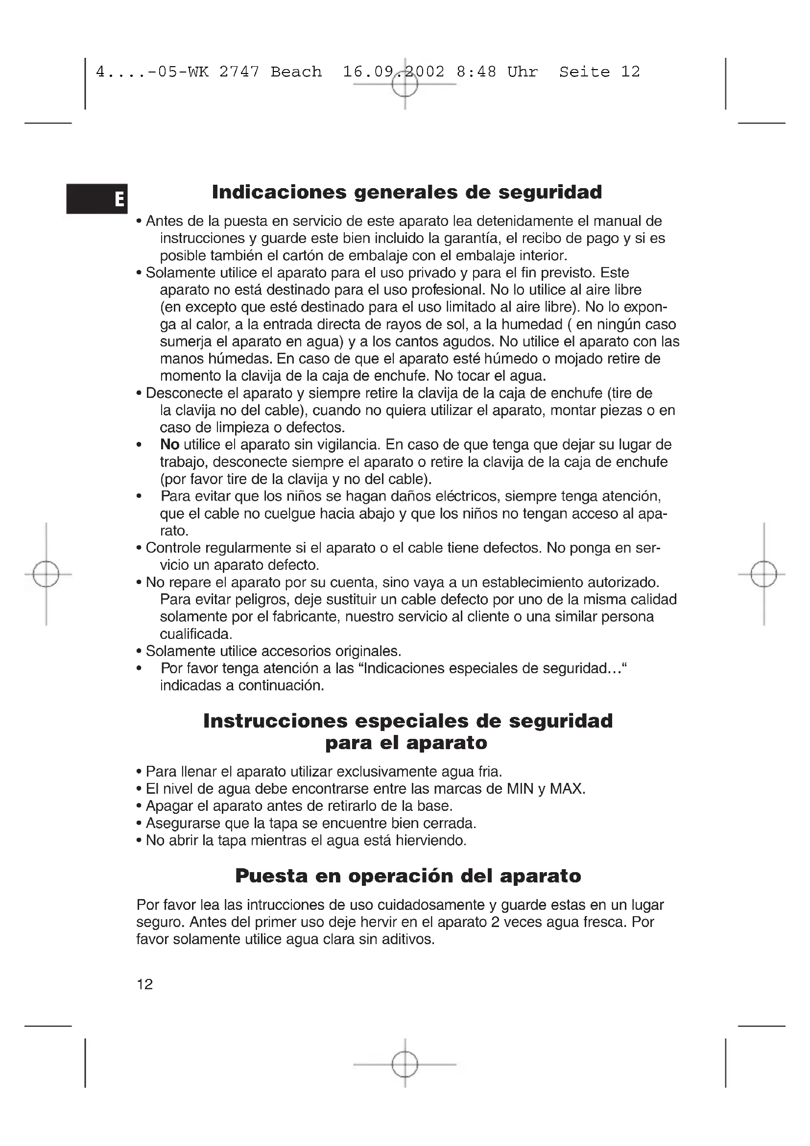 - No abrir la tapa mientras el agua está hierviendo. Puesta en operación del aparato Por favor lea las intrucciones de uso cuidadosamente y guarde estas en un lugar seguro. Antes del primer uso deje hervir en el aparato 2 veces agua fresca. Por favor solamente utilice agua clara sin aditivos.