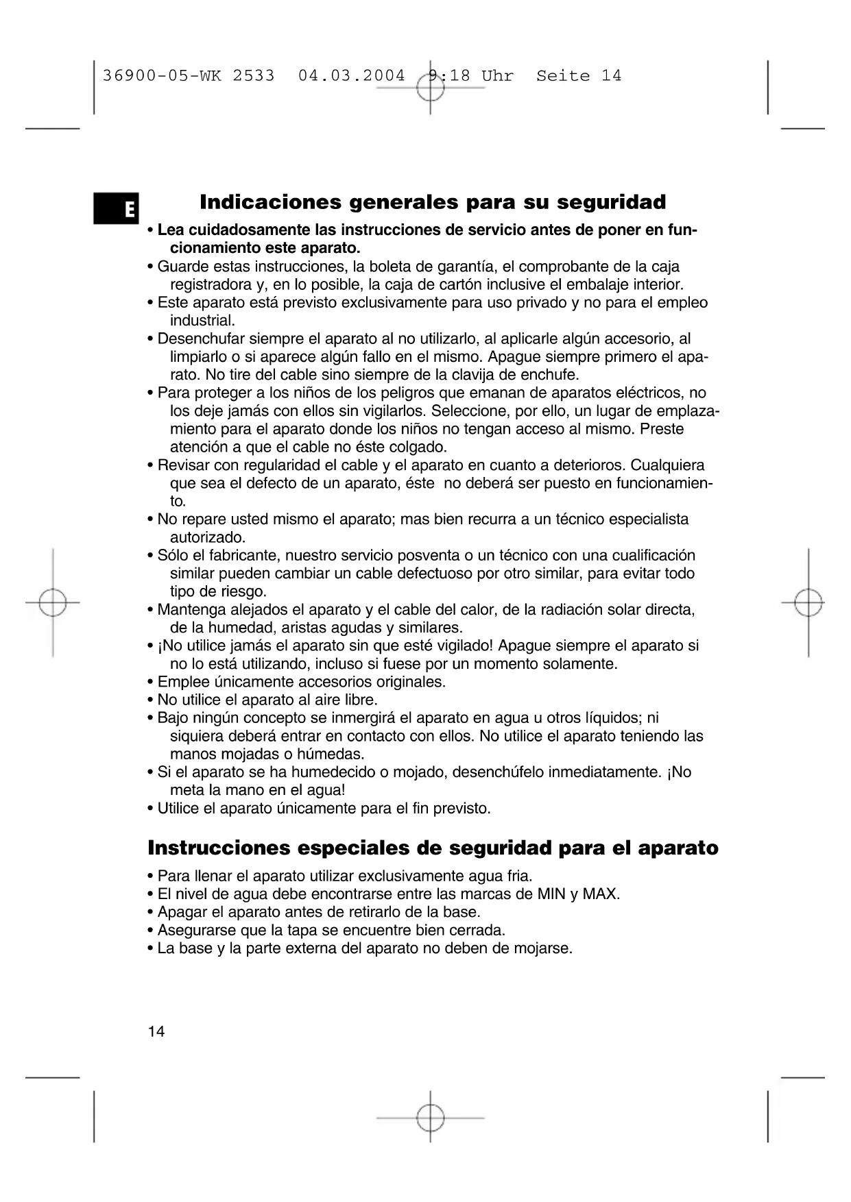 36900-05-WK 2533 04.03.2004 9:18 Uhr Seite 14Puesta en operación del aparato Antes de su uso, hervir 2 veces con agua limpia/fresca y sin aditivos.