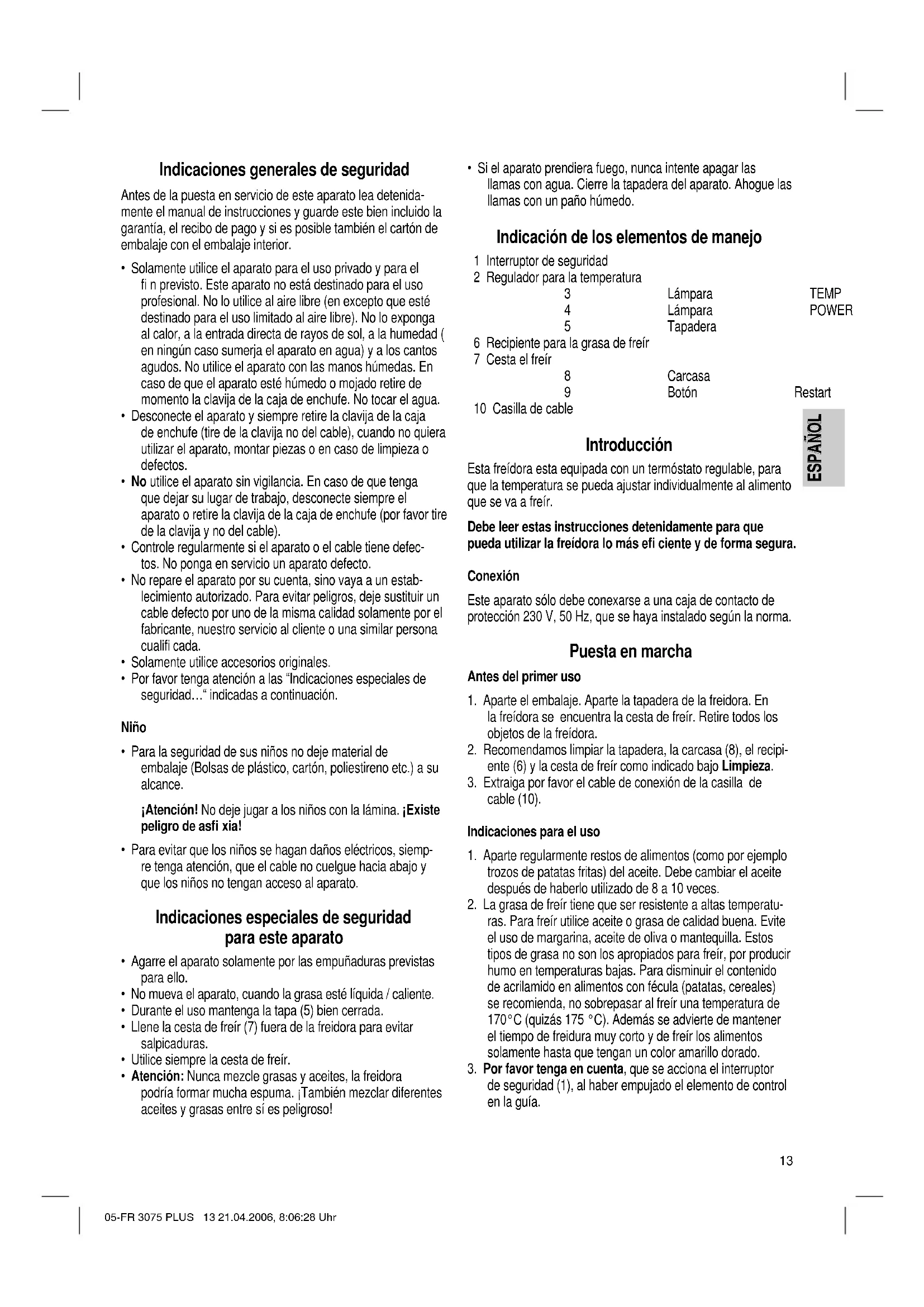 - Si el aparato prendiera fuego, nunca intente apagar las llamas con agua. Cierre la tapadera del aparato. Ahogue las llamas con un paño húmedo. Indicación de los elementos de manejo 1 Interruptor de seguridad 2 Regulador para la temperatura 3 Lámpara TEMP (rojo) 4 Lámpara POWER (verde) 5 Tapadera 6 Recipiente para la grasa de freír 7 Cesta el freír 8 Carcasa 9 Botón Restart 10 Casilla de cable Introducción Esta freídora esta equipada con un termóstato regulable, para que la temperatura se pueda ajustar individualmente al alimento que se va a freír. Debe leer estas instrucciones detenidamente para que pueda utilizar la freídora lo más efi ciente y de forma segura. Conexión Este aparato sólo debe conexarse a una caja de contacto de protección 230 V, 50 Hz, que se haya instalado según la norma. Puesta en marcha Antes del primer uso