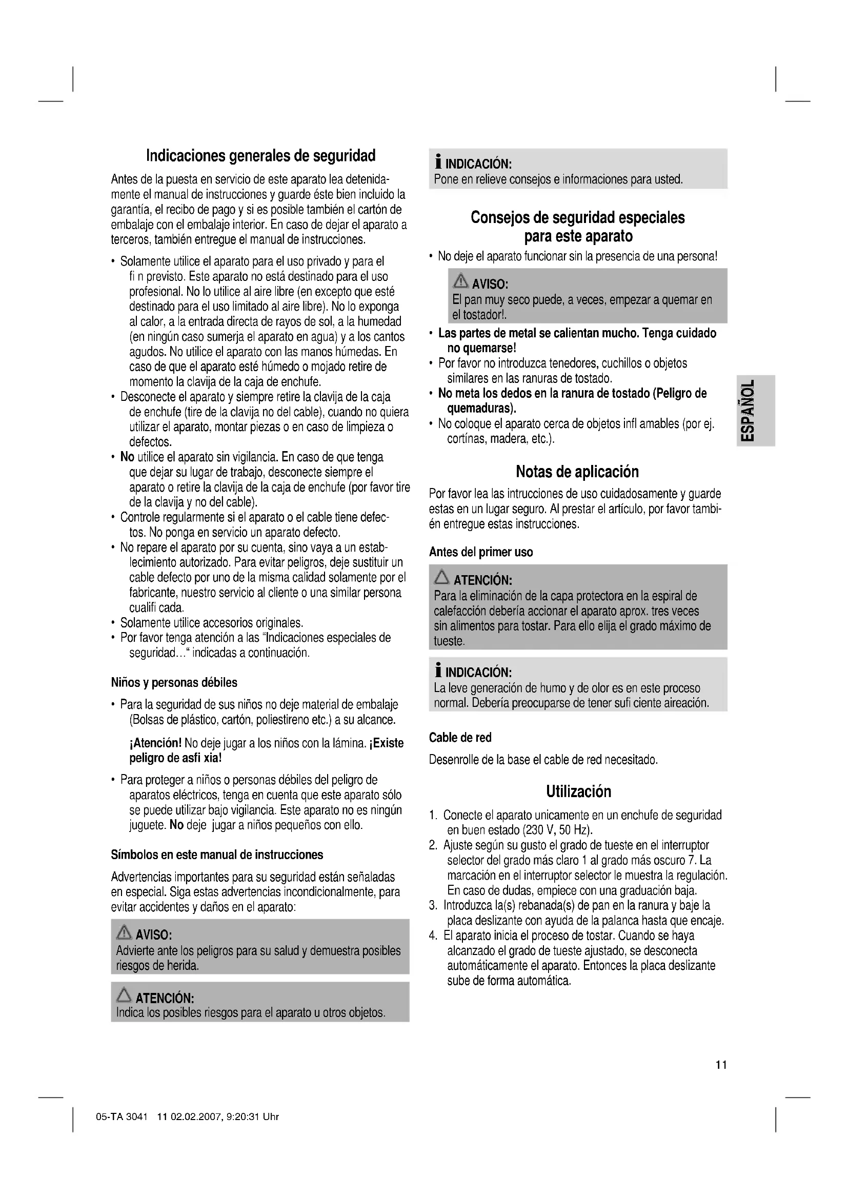 Atencion! No deje jugar a los niños con la lámina. Existeligro de asfi xia! - Para proteger a niños o personas débiles del peligro de aparatos electricos,onga en cuenta que este aparato solo se pueda usar bajo vigilancia. Este aparato no es ningún juguete. Nocede hacer a niños微量元素 conarlo.