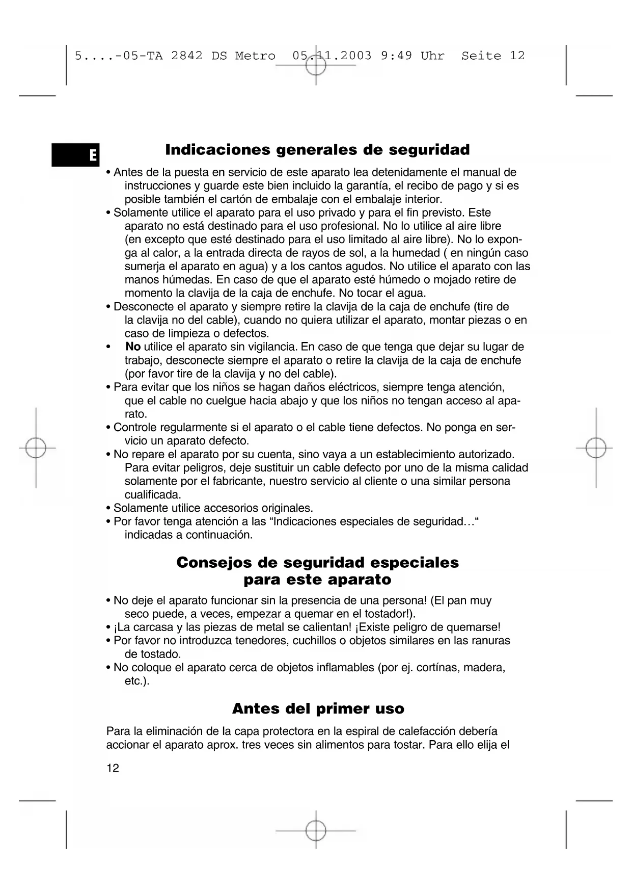 5....-05-TA 2842 DS Metro 05.11.2003 9:49 Uhr Seite 12grado máximo de tueste. La leve generación de humo y de olor es en este proceso normal. Debería preocuparse de tener suficiente aireación. Utilización